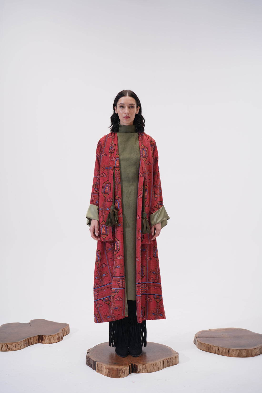 Delivery is subjected to availability Deep rust, clay and subtle black accents soft fur Bisht....