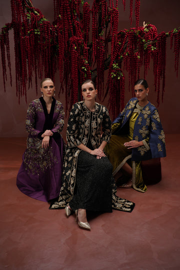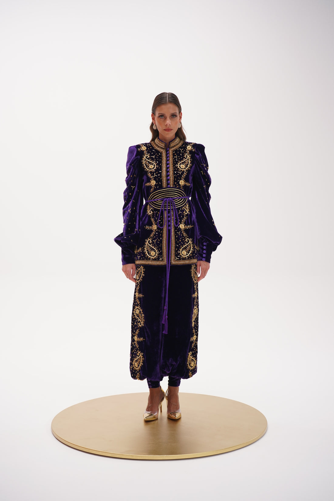 Pre-order: 14 to 20 working days. Regal royal-purple velvet two-piece with ornate gold embroidery and...