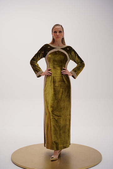 An army green microsuede draped-collar with hand stitch detail maxi dress, featuring a sewn-in wrapover...