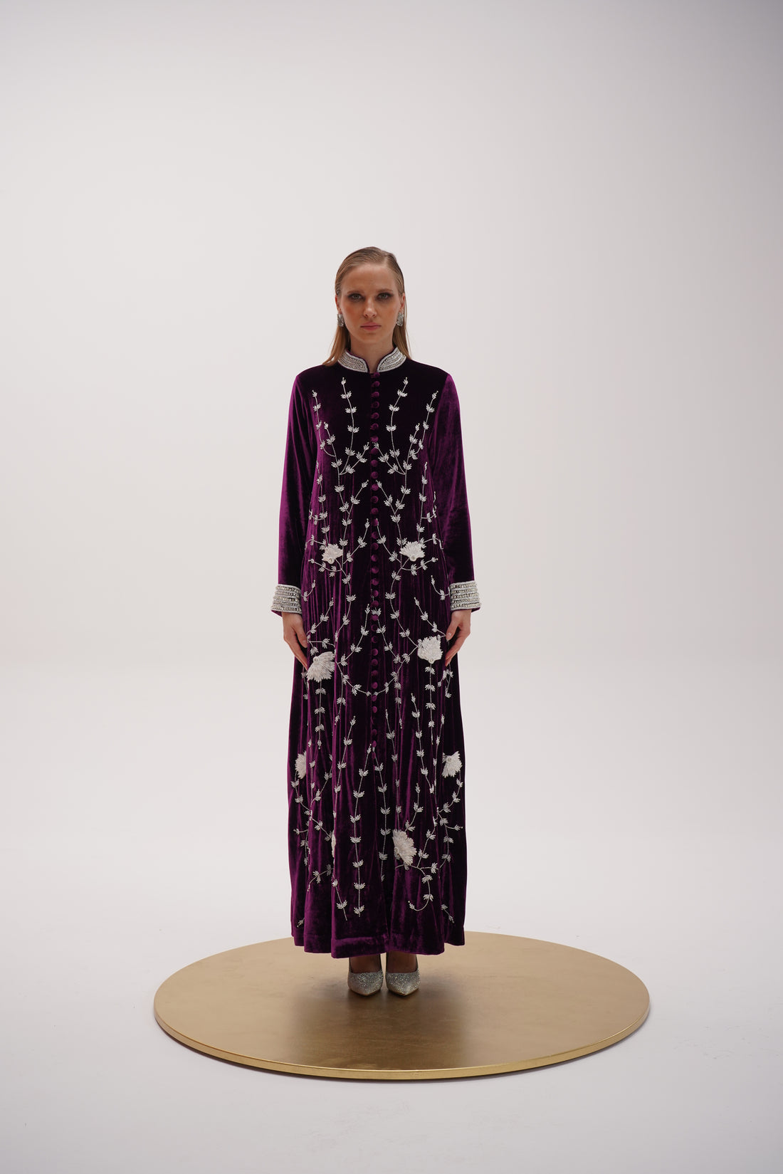 Pre-order: 10 to 15 working days. Two-piece set of maroon silk velvet robe, embellished with...