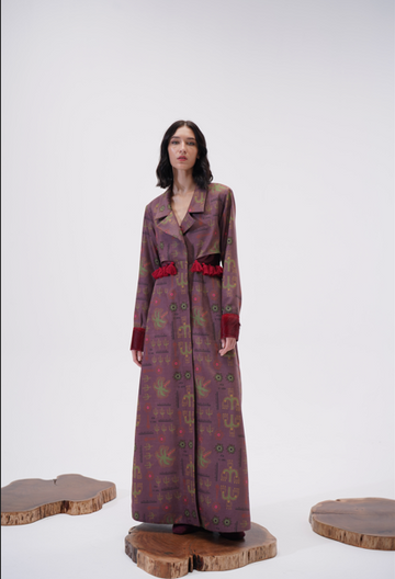 Pre-order: 7 to14 working days. Structured mud oak velvet long coat, front-button fastening with attached...