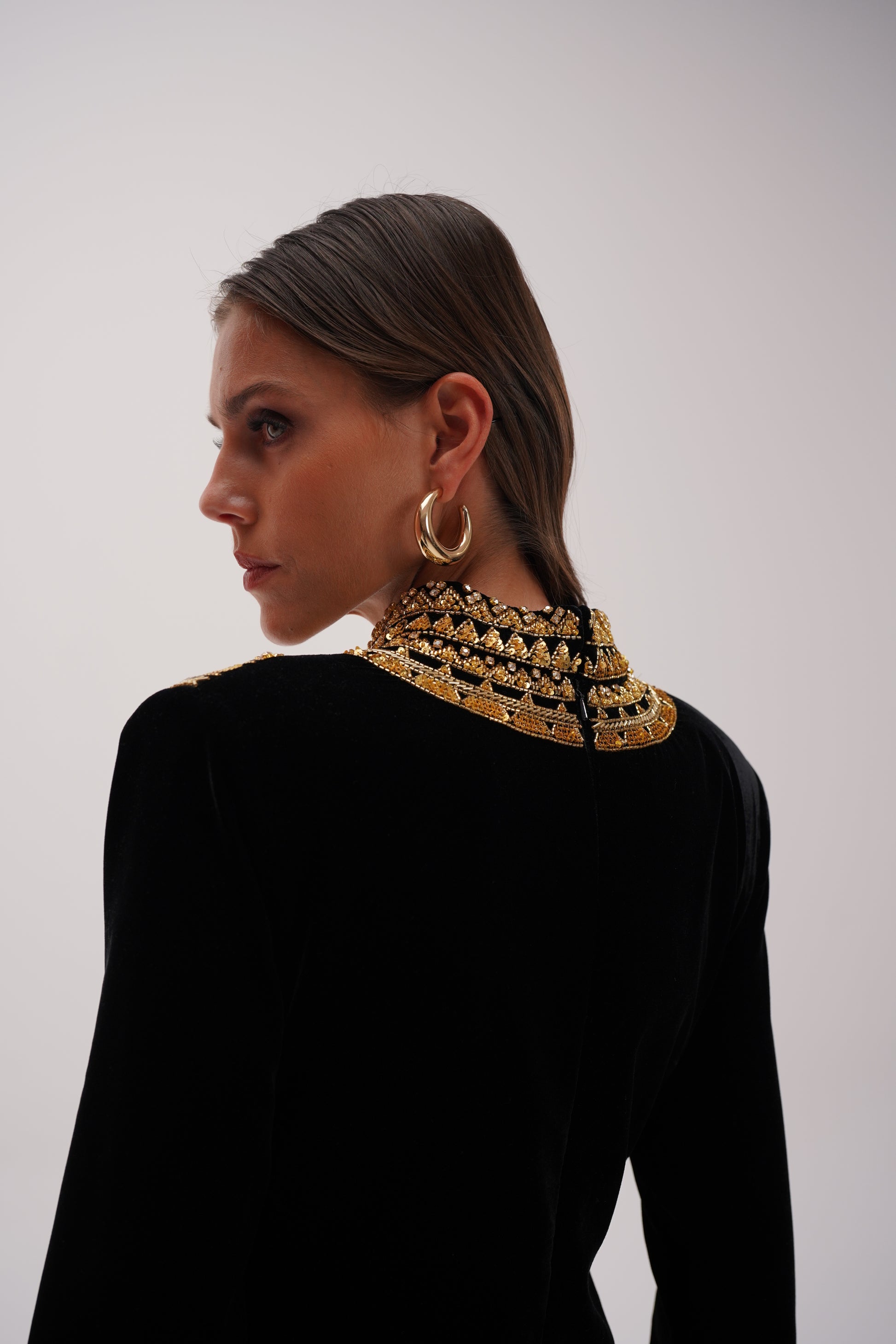 Noir silk velvet kaftan with side slits, handmade embroidered small mirror with unique cuts are handcrafted by skilled artisans. Detailed embroidery and rich fabric giving it a luxurious appearance.