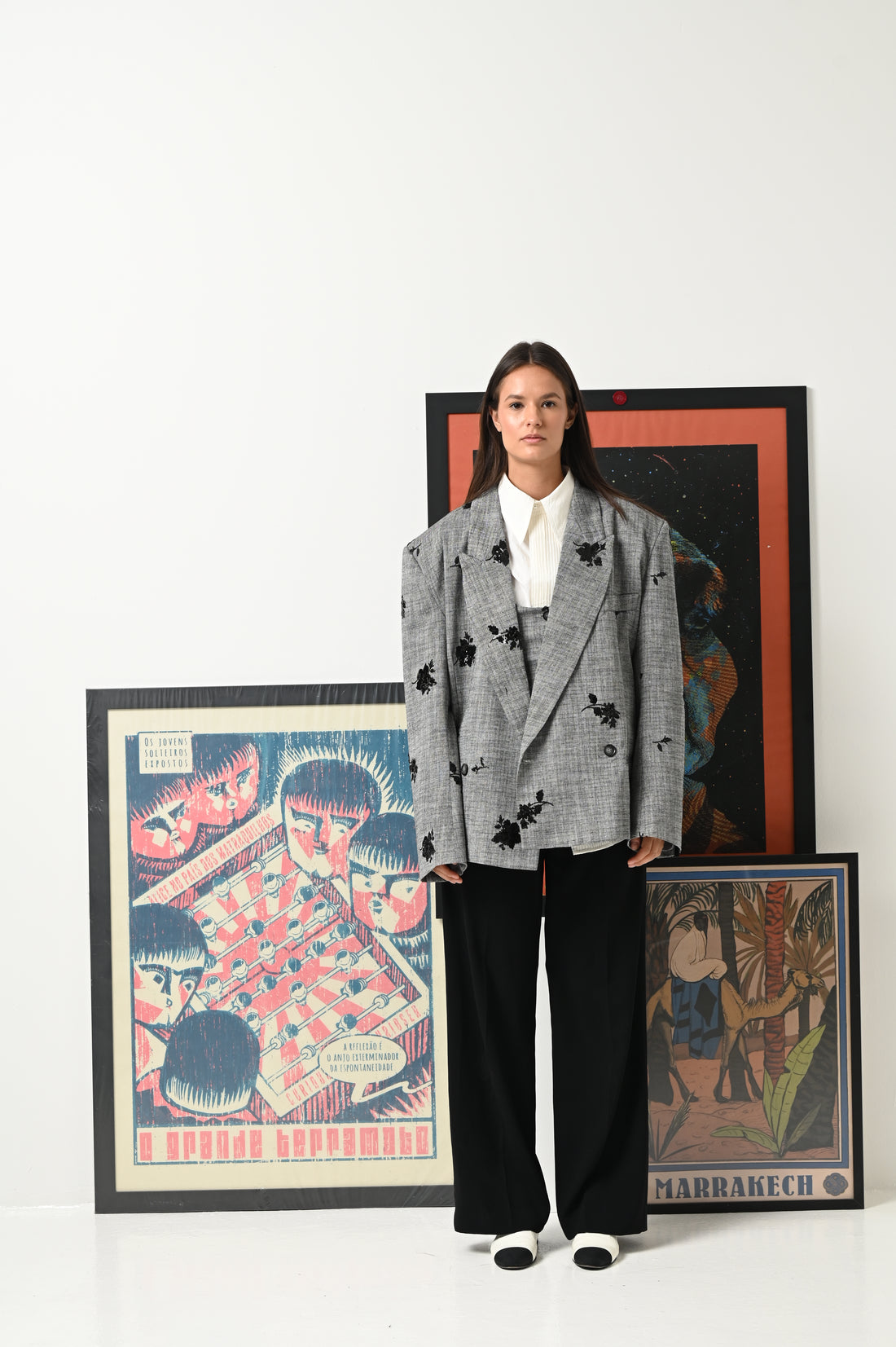 Oversized Floral Printed Collarless V-Neck Blazer + Barrel Leg Pants Set. Available to order custom...