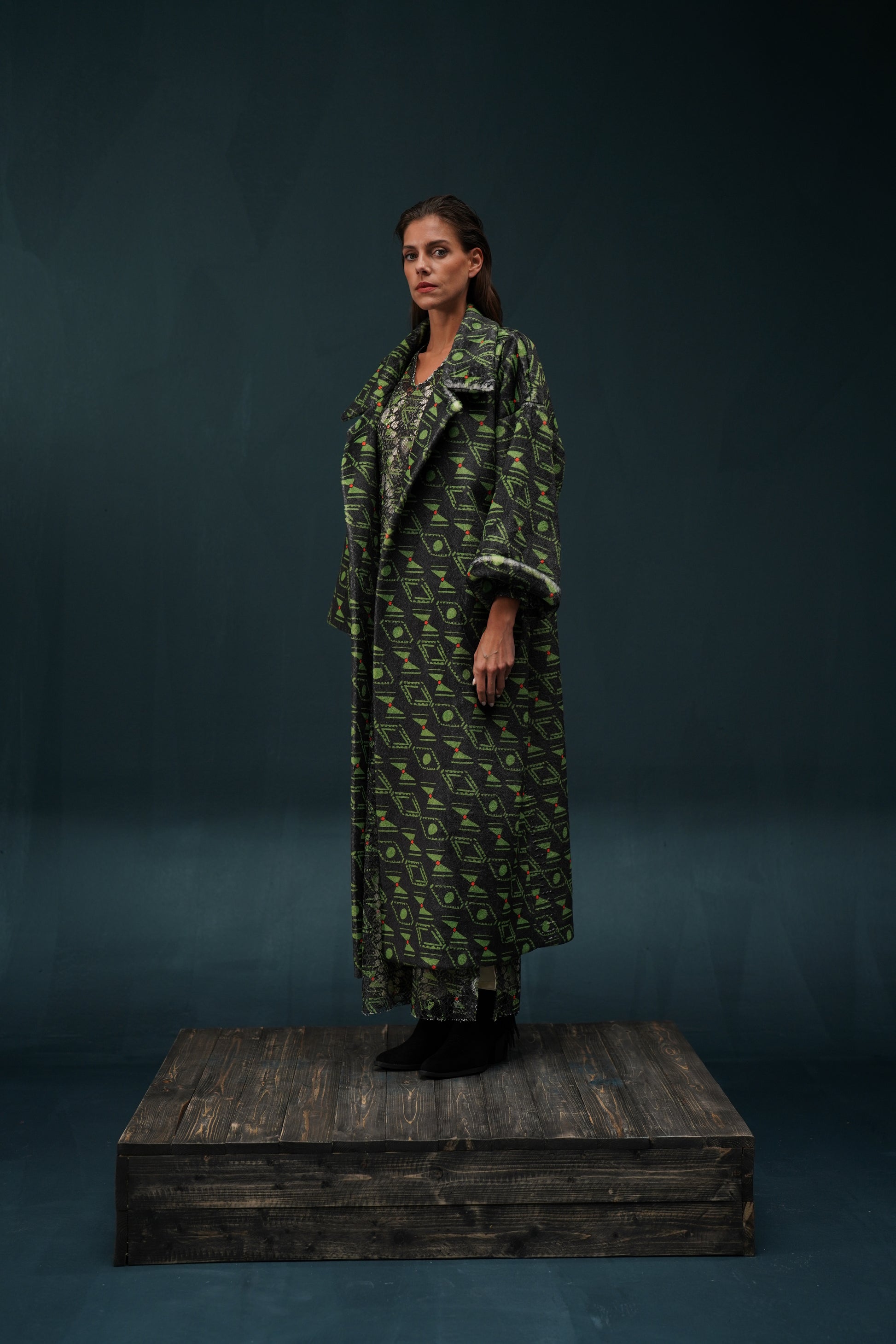 Elegant lace inner fit dress with side slits, with long sleeves that skims the body without clinging worn with soft collard fur Bisht that blends artisanal pattern in deep forest green.