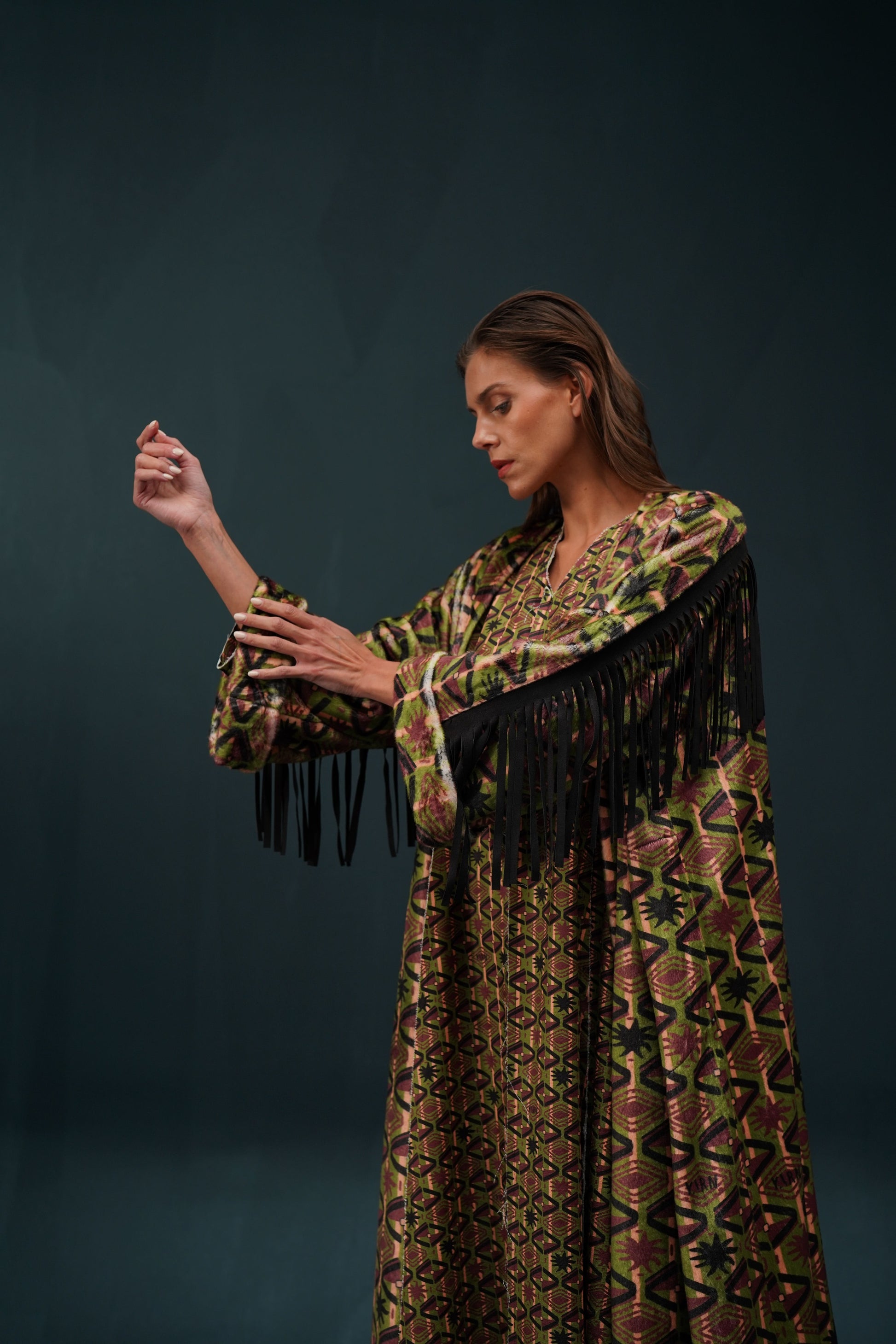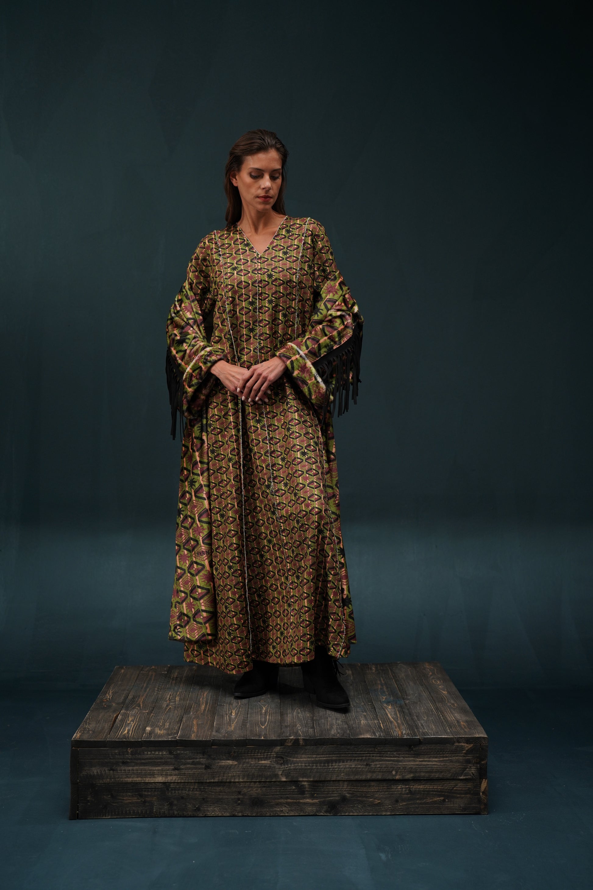 Over corduroy inner dress intricate geo motifs in earthy olive green, muted gold and deep brown tones.