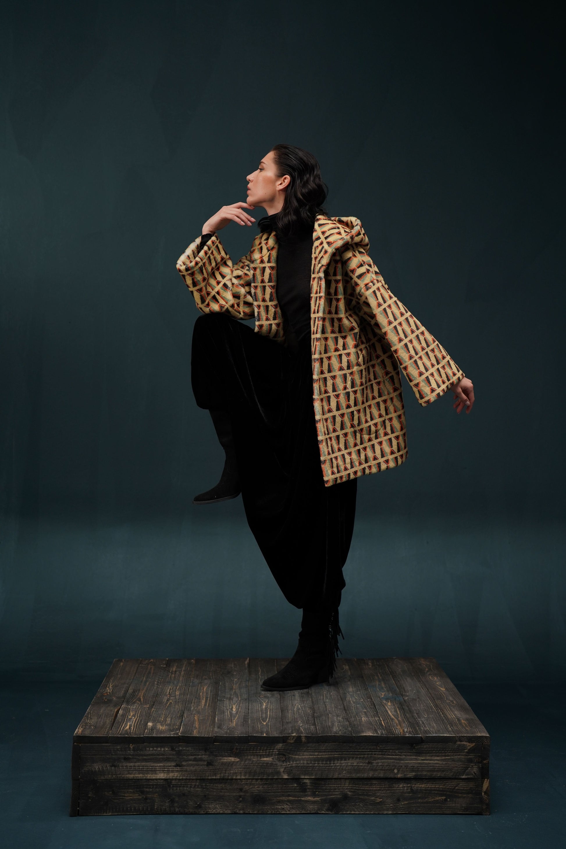 An open-front soft fur hooded jacket/bisht personalized YARN print, crafted to balance artistry and wearability, paired with black velvet harem pants.