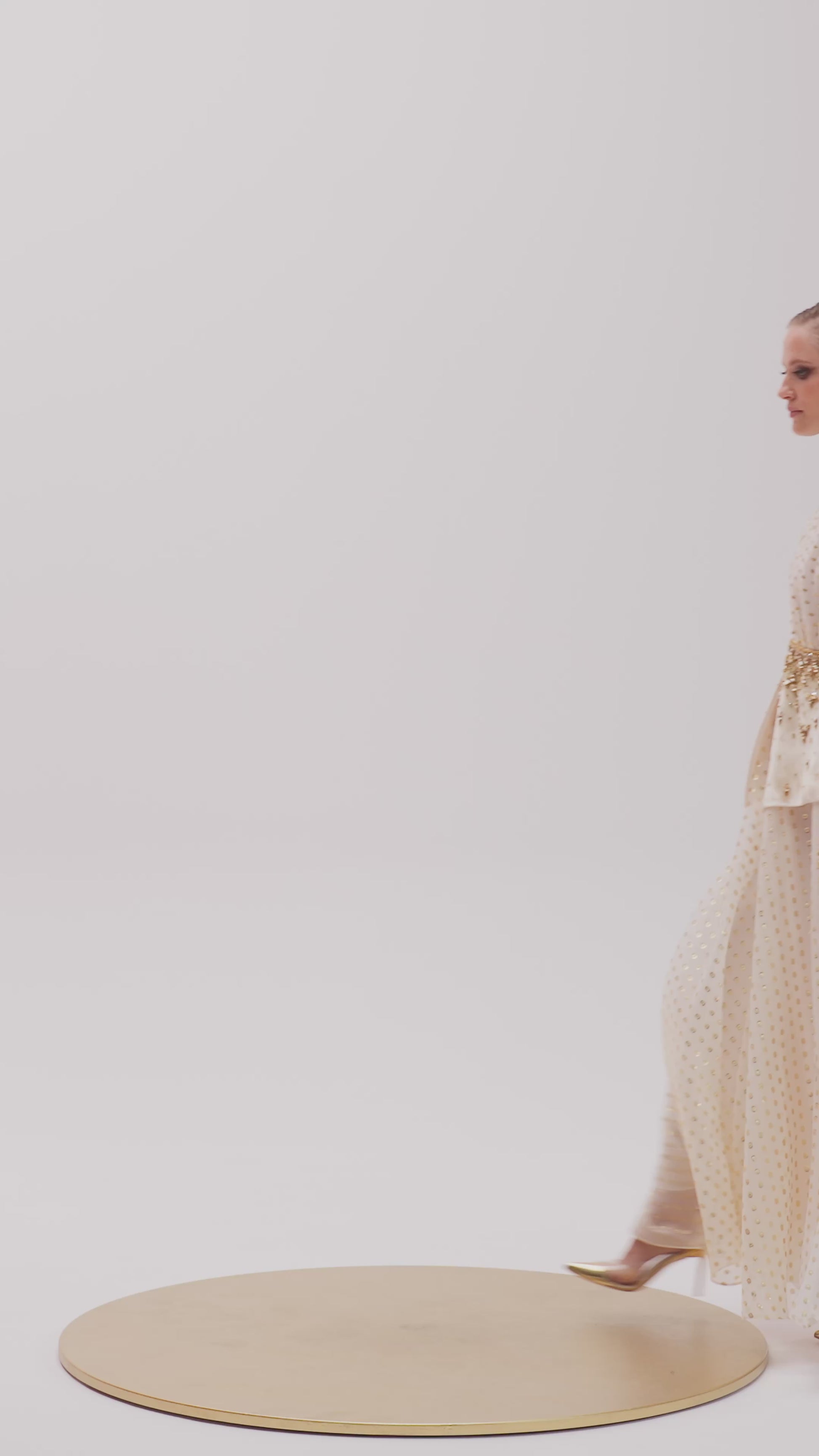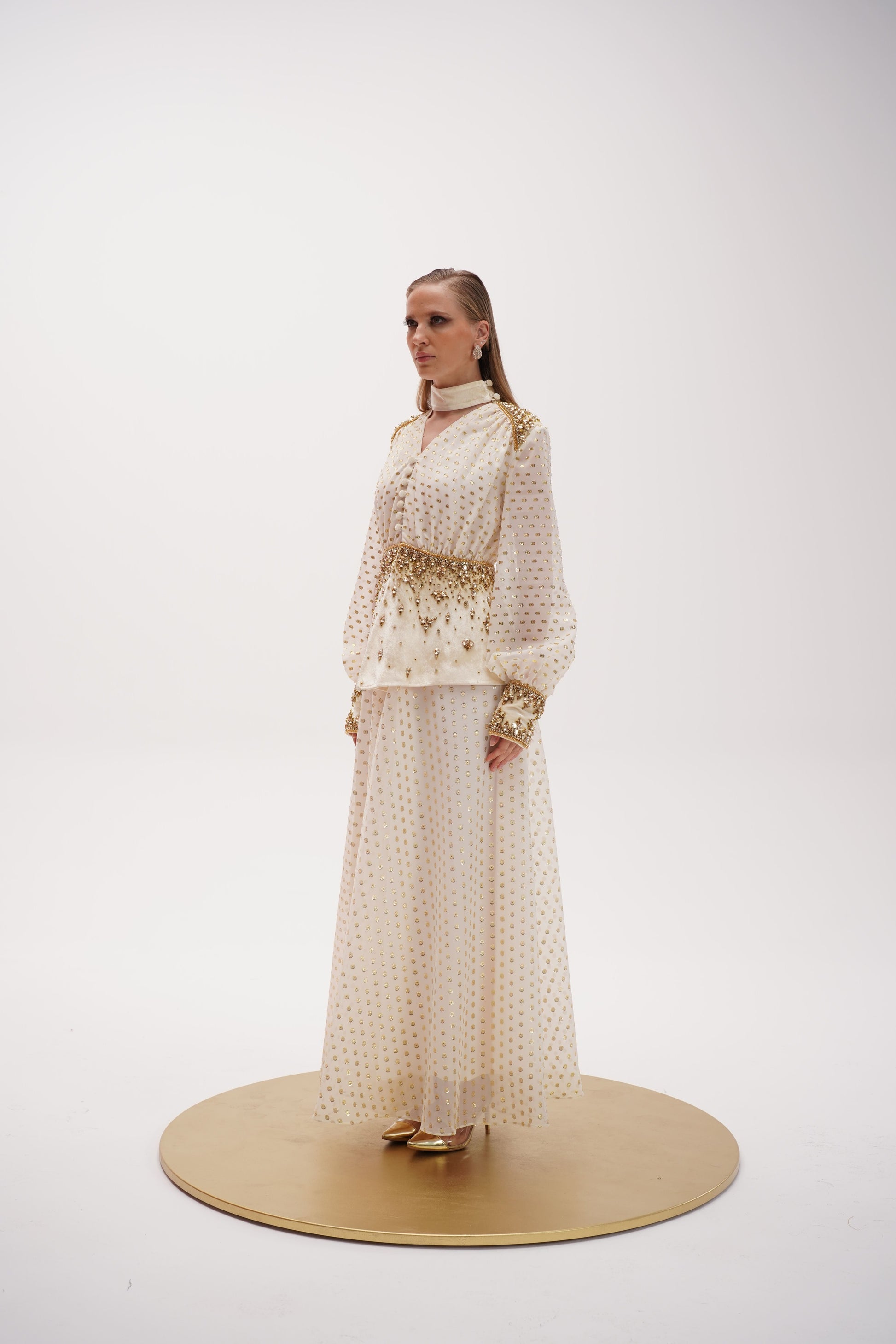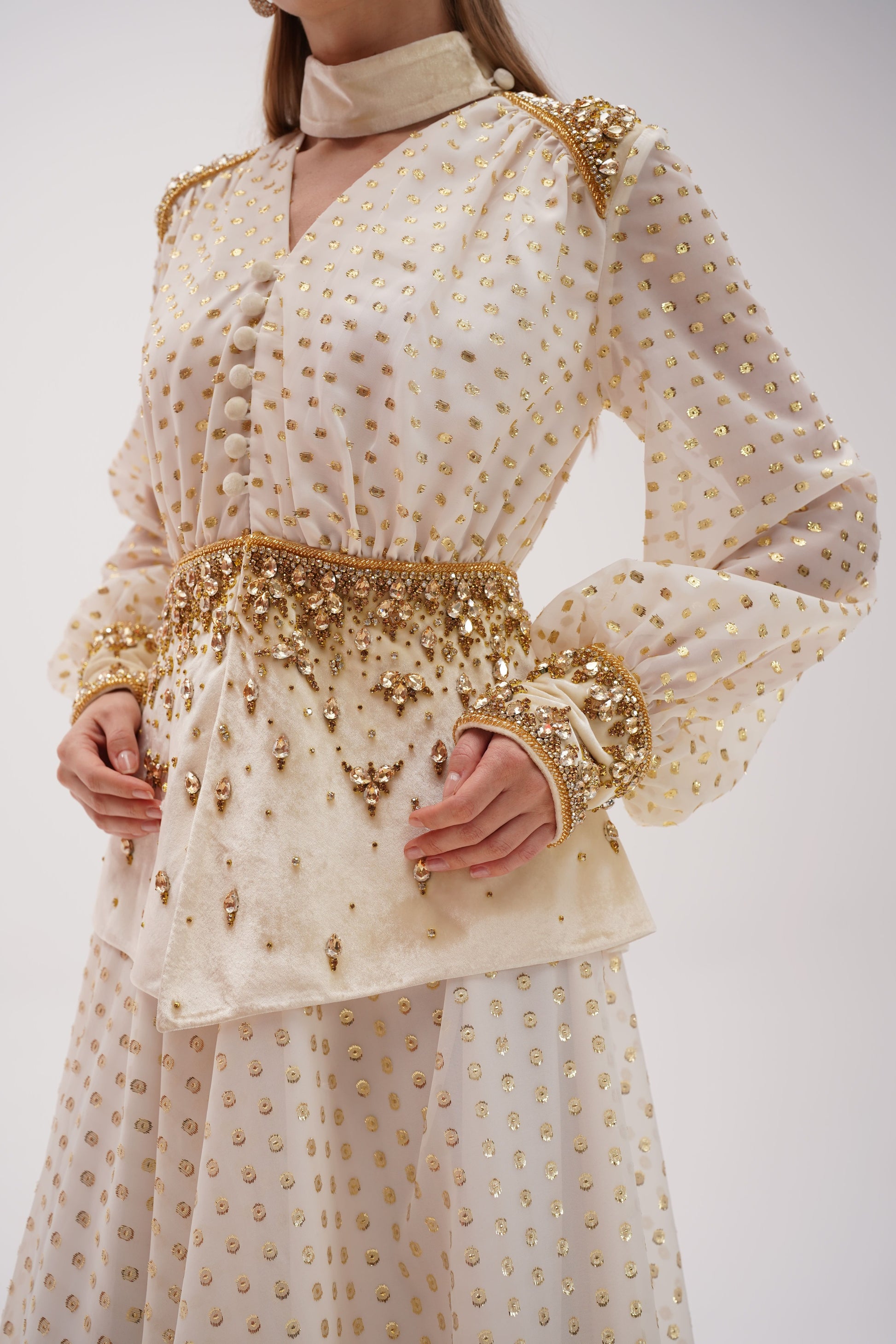 A luminous expression of modern elegance-crafted for timeless beauty, softly tailored V-neckline, framed by a velvet strap collar with voluminous sleeves finish with ornate, hand-embellished cuffs.