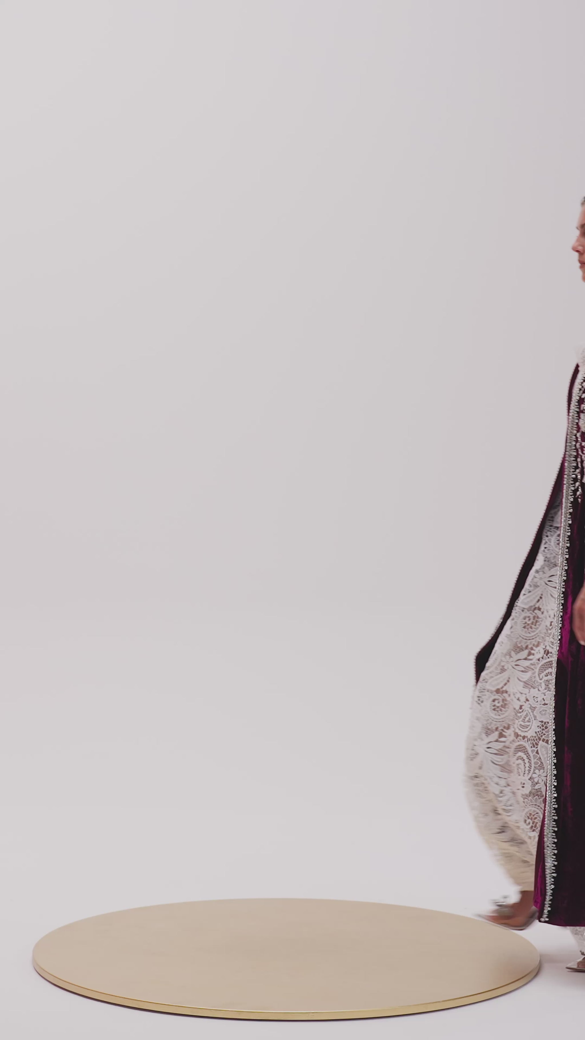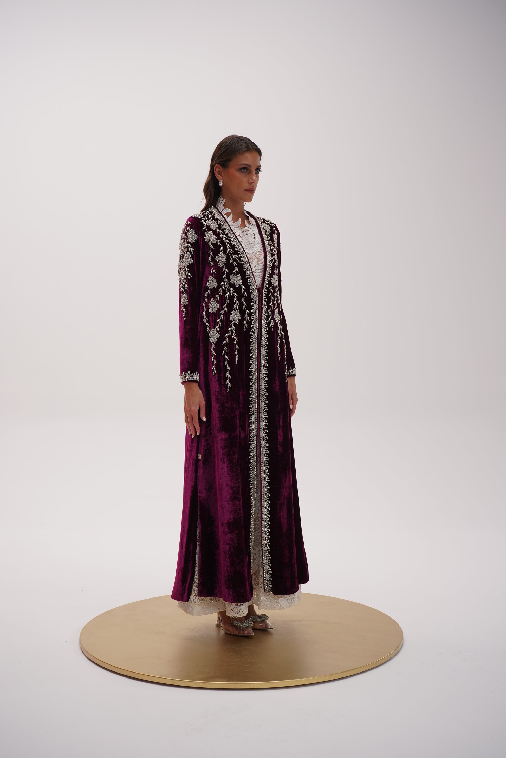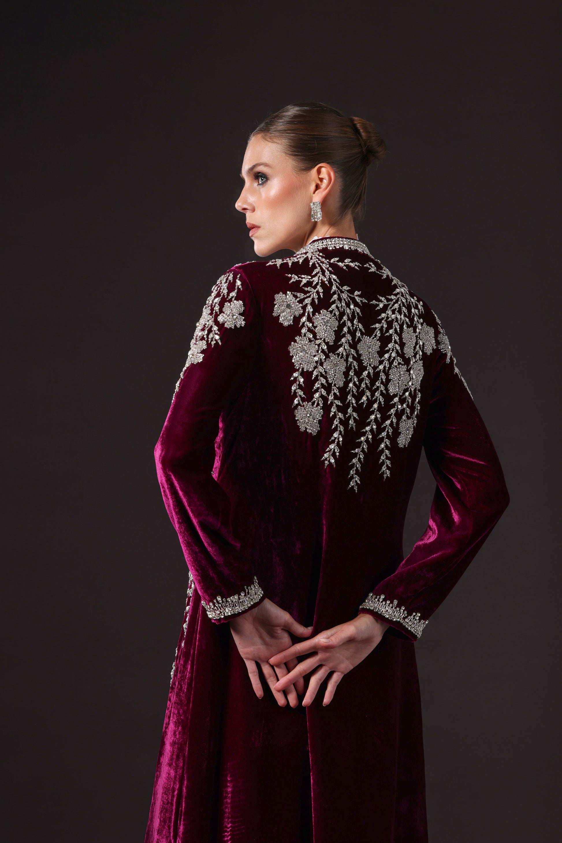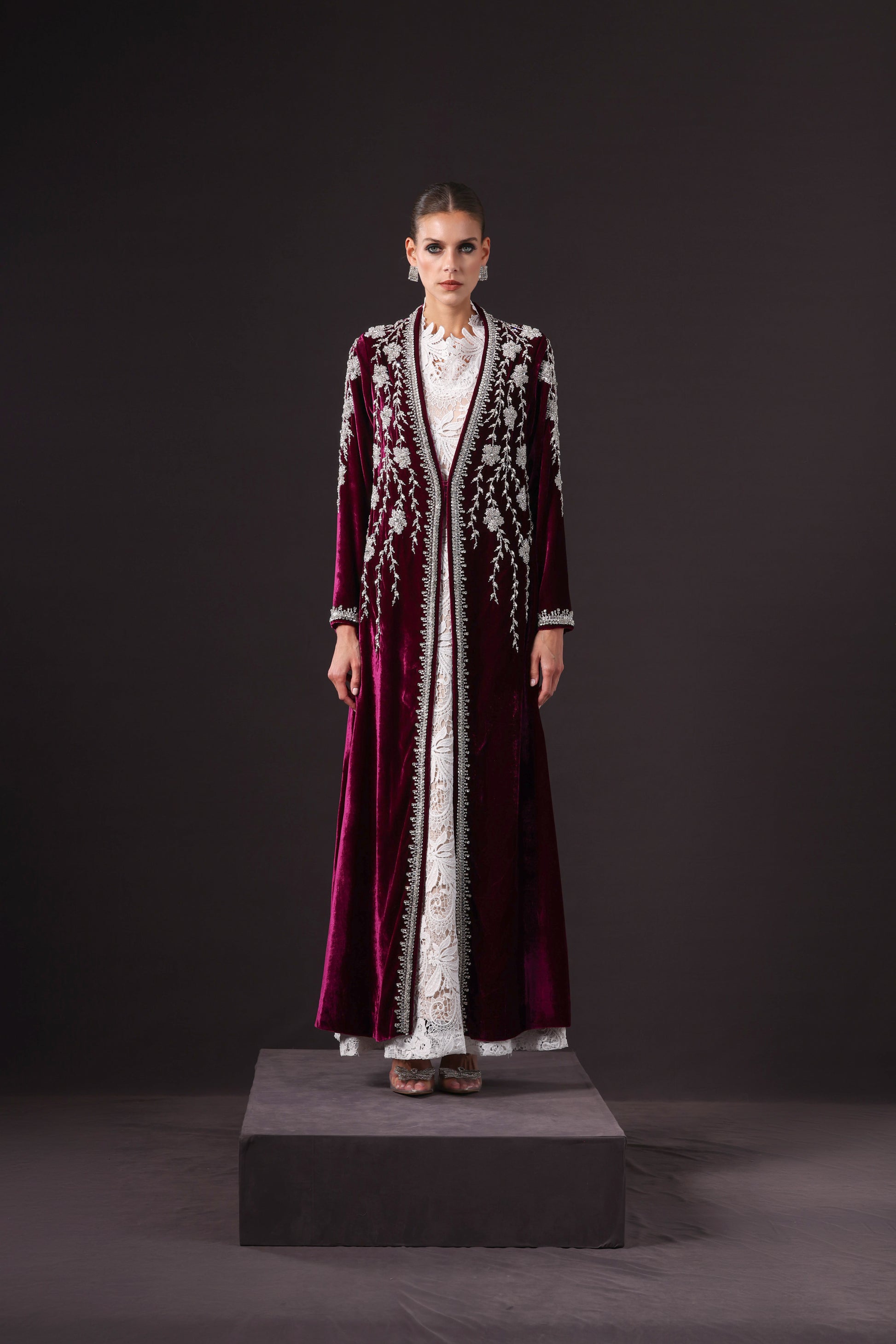 Two-piece set of maroon silk velvet robe, embellished with handmade embroidery and delicate Swarovski beads worn over a sleeveless A-line dress crafted from luxurious fabric guipure dentelle.