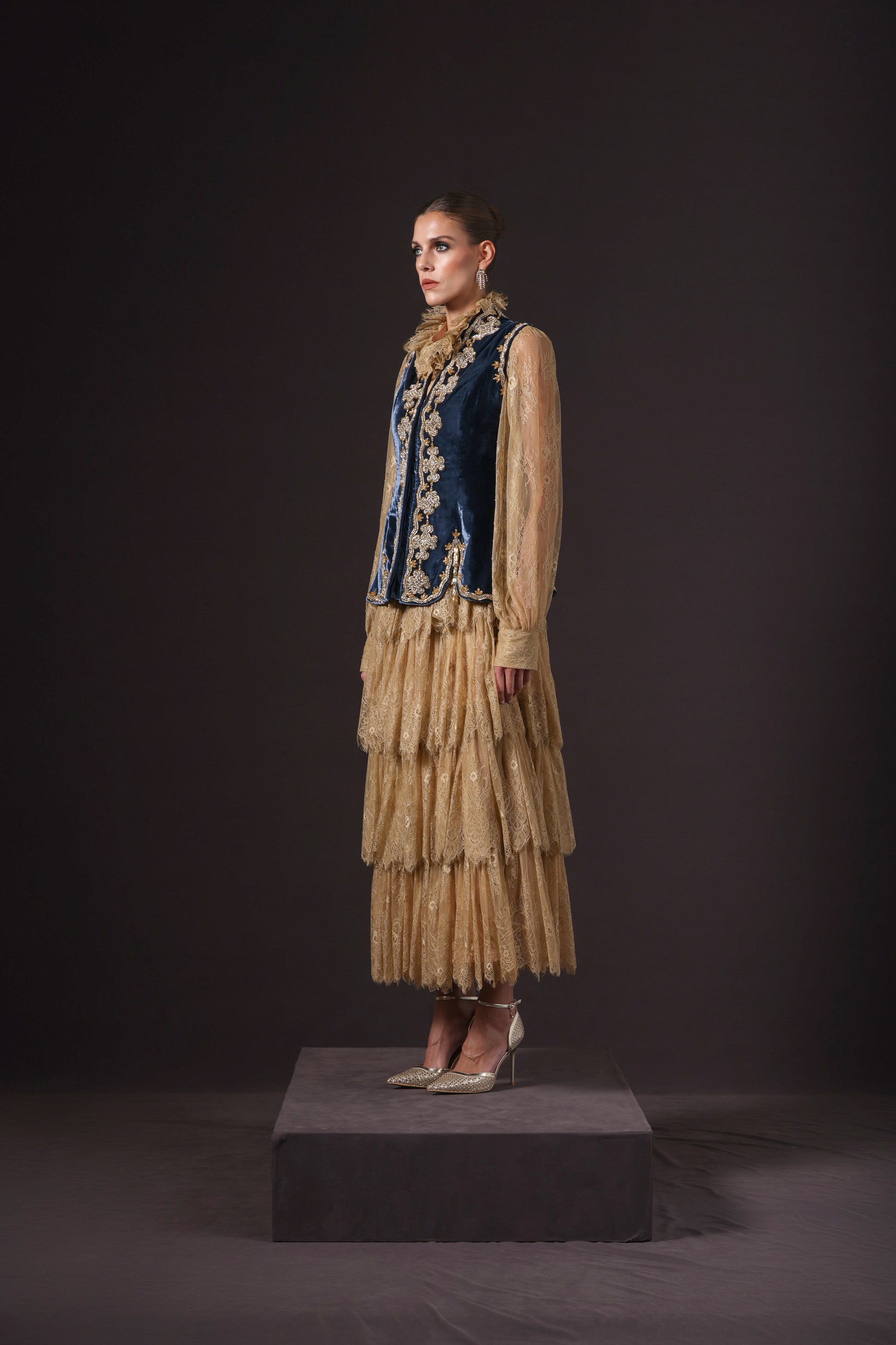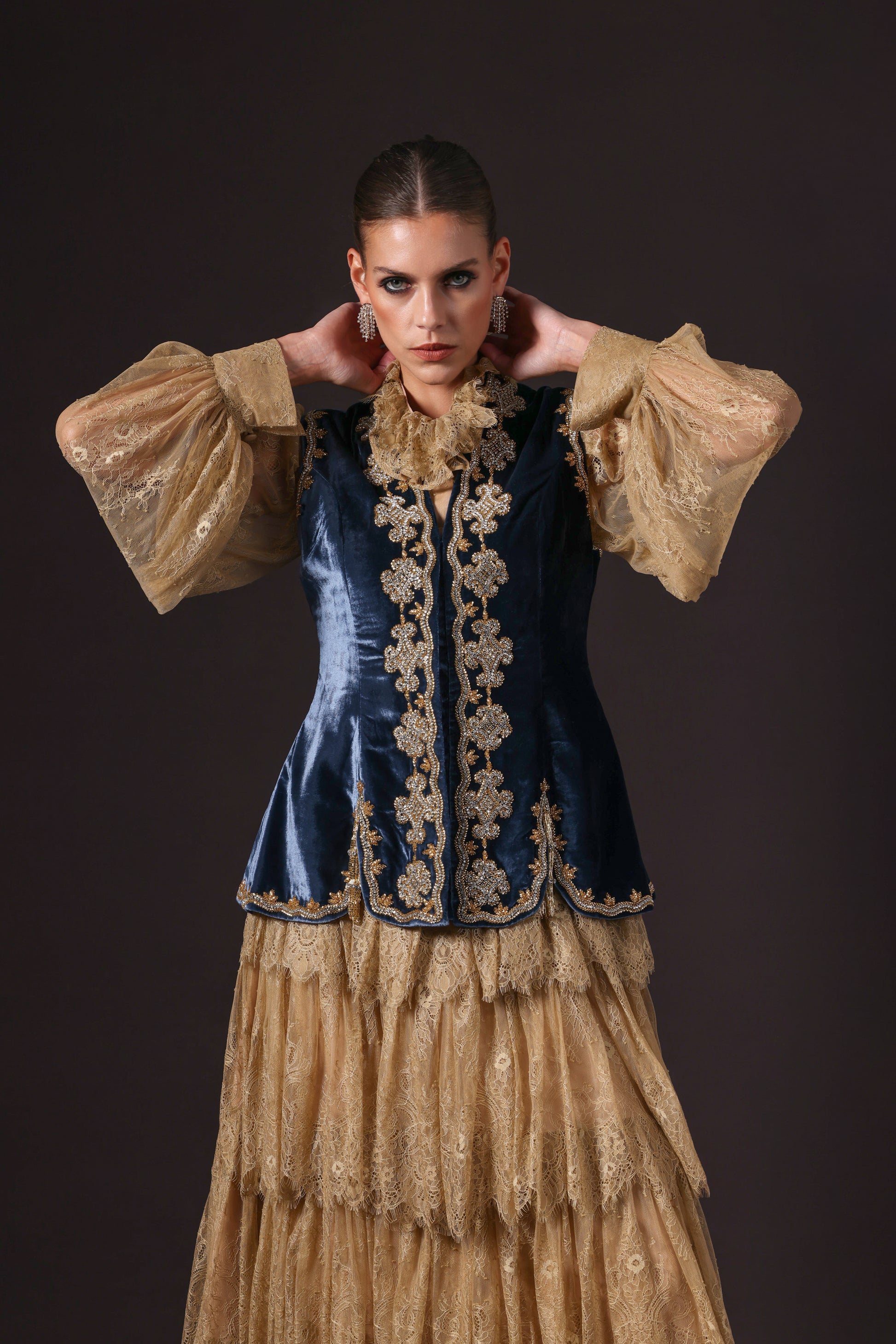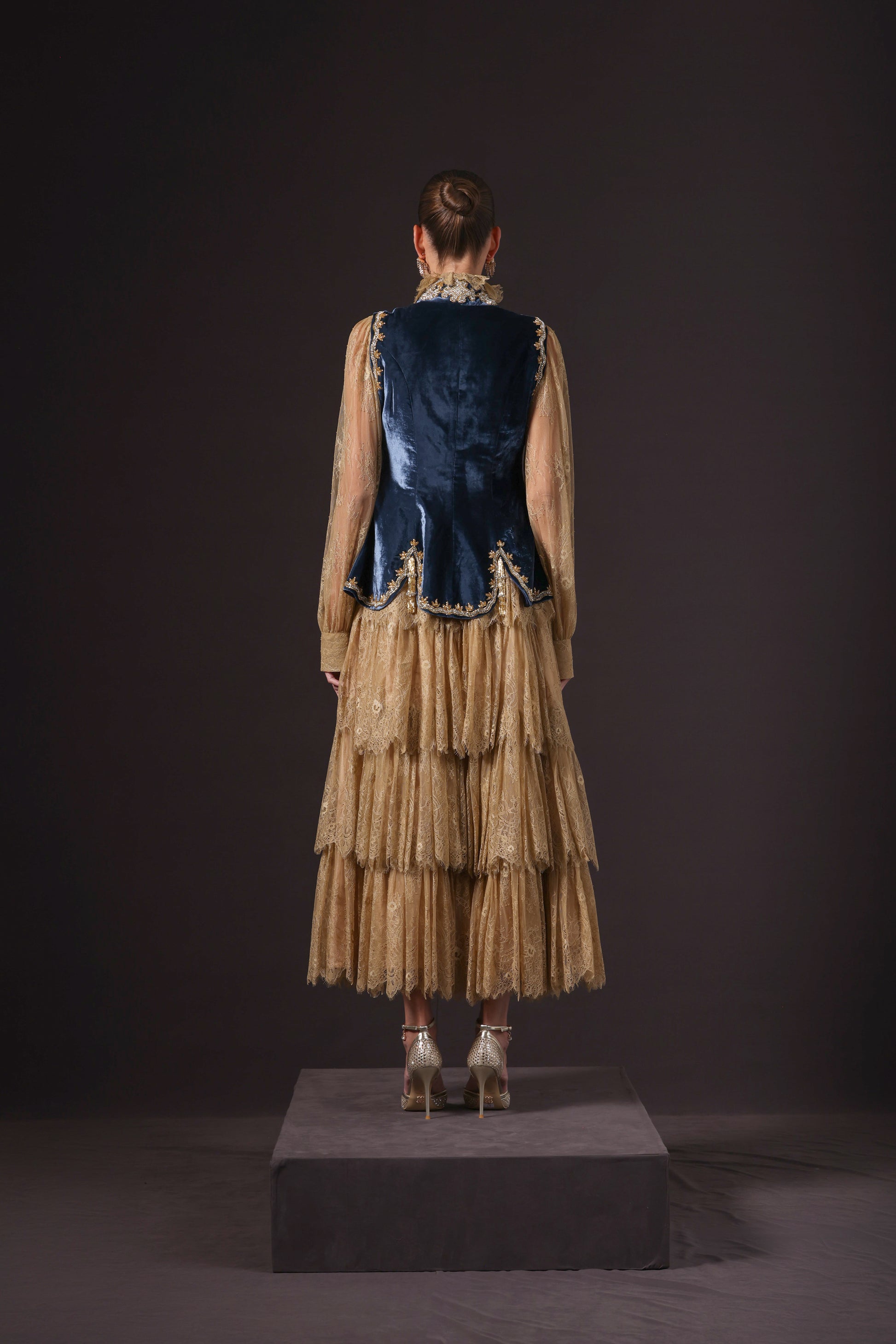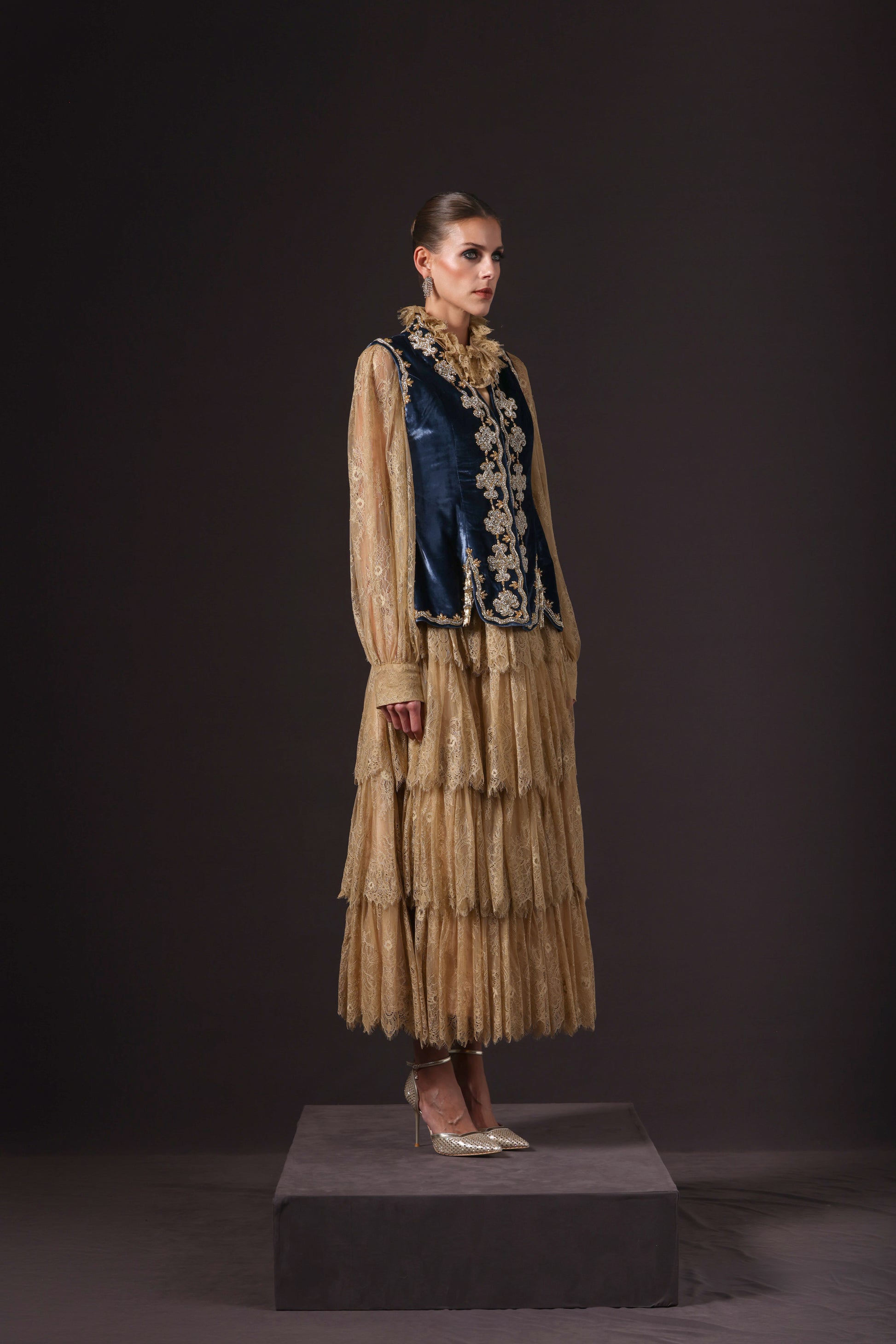 A destinctive richly embroidered fitted vintage blue silk velvet vest, crafted with detailed gold and vibrant design, worn over a gold-colored, dentelle loose-fitting shirt and tiered long skirt.