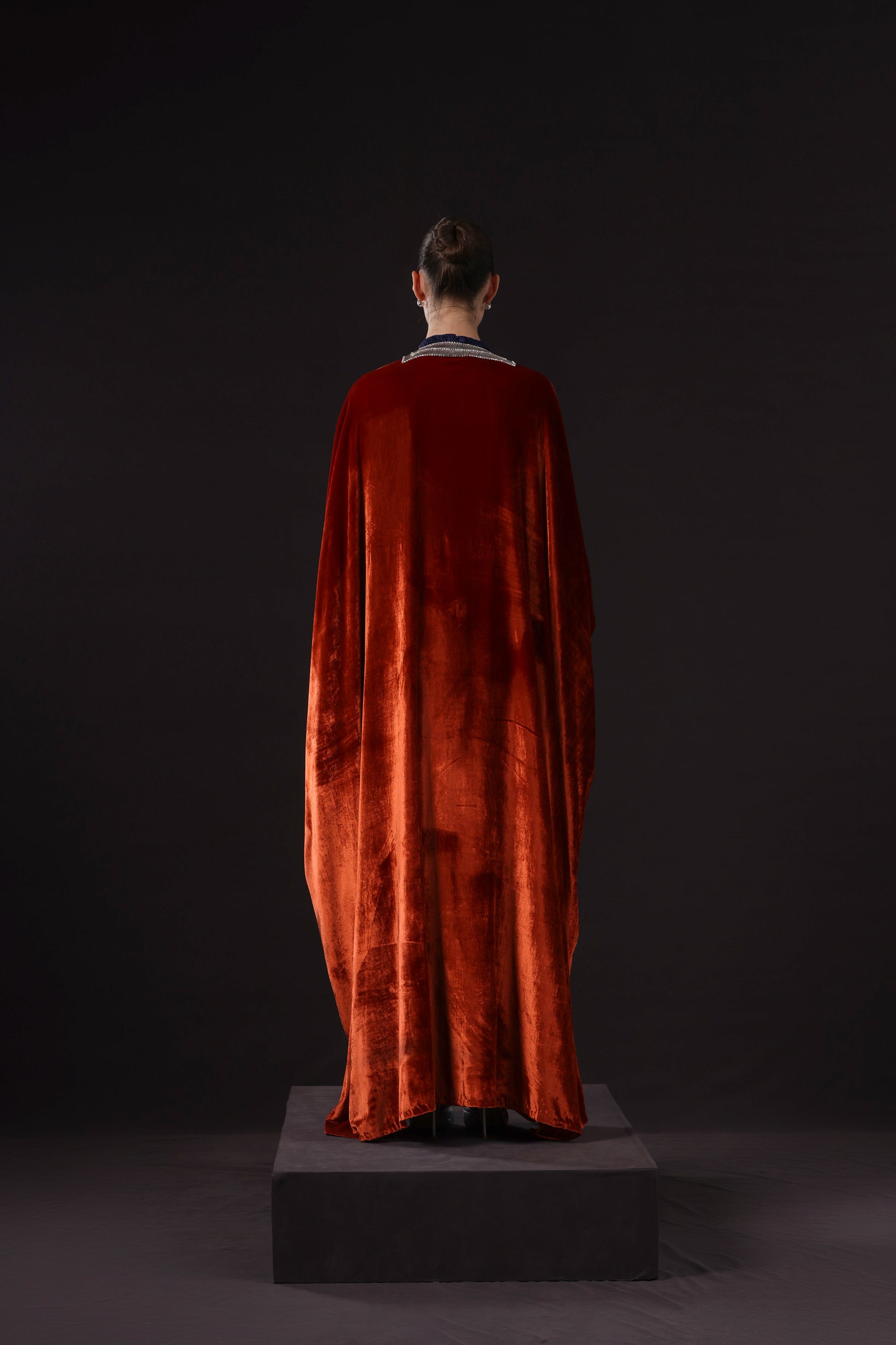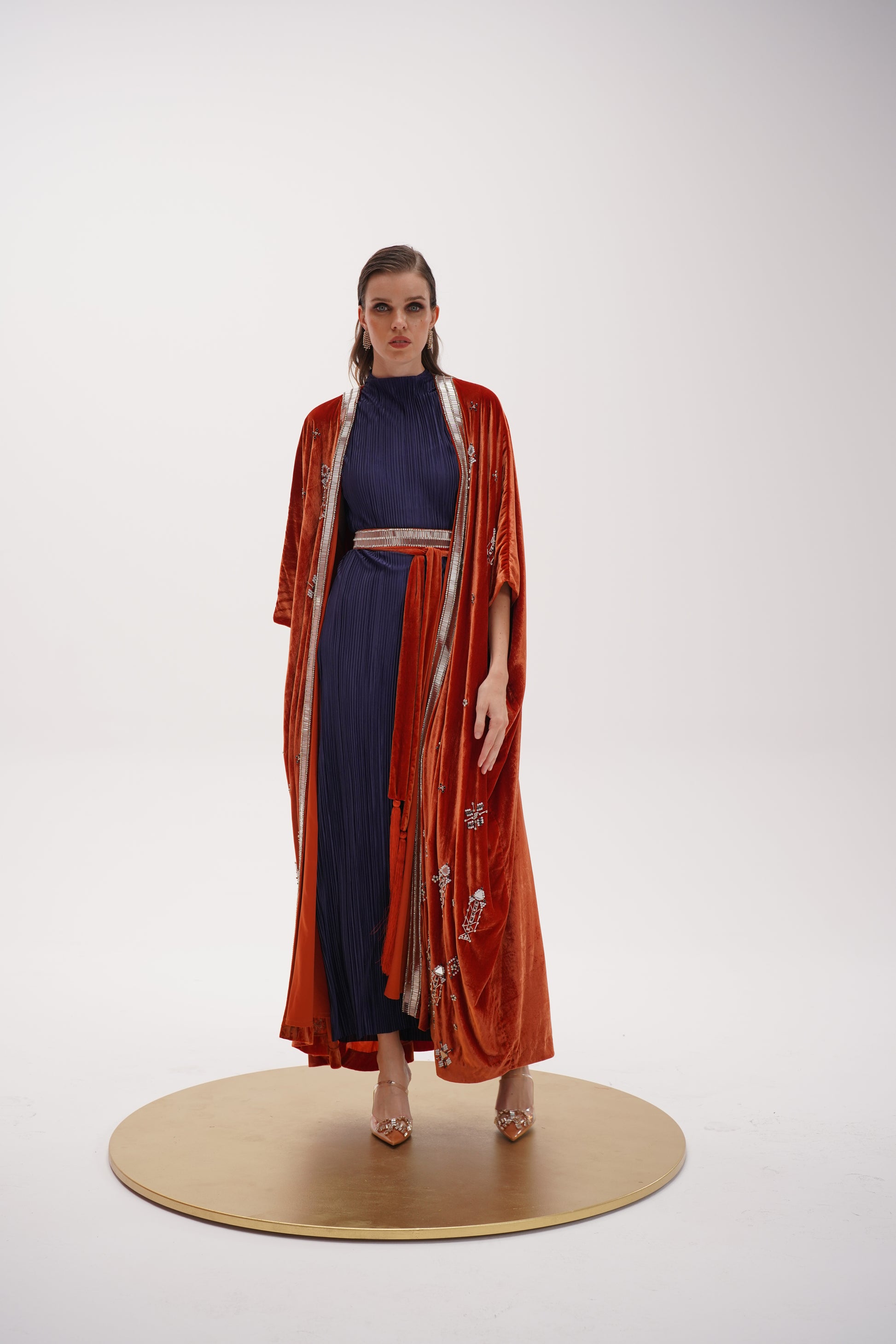 Two-piece Kimono style in rich marmalade silk velvet with Swarovski beads embellishments, detailed handwork belt that adds a touch of sophistication with a sleeveless navy blue high-neck, long fitted silk plisse inner dress.