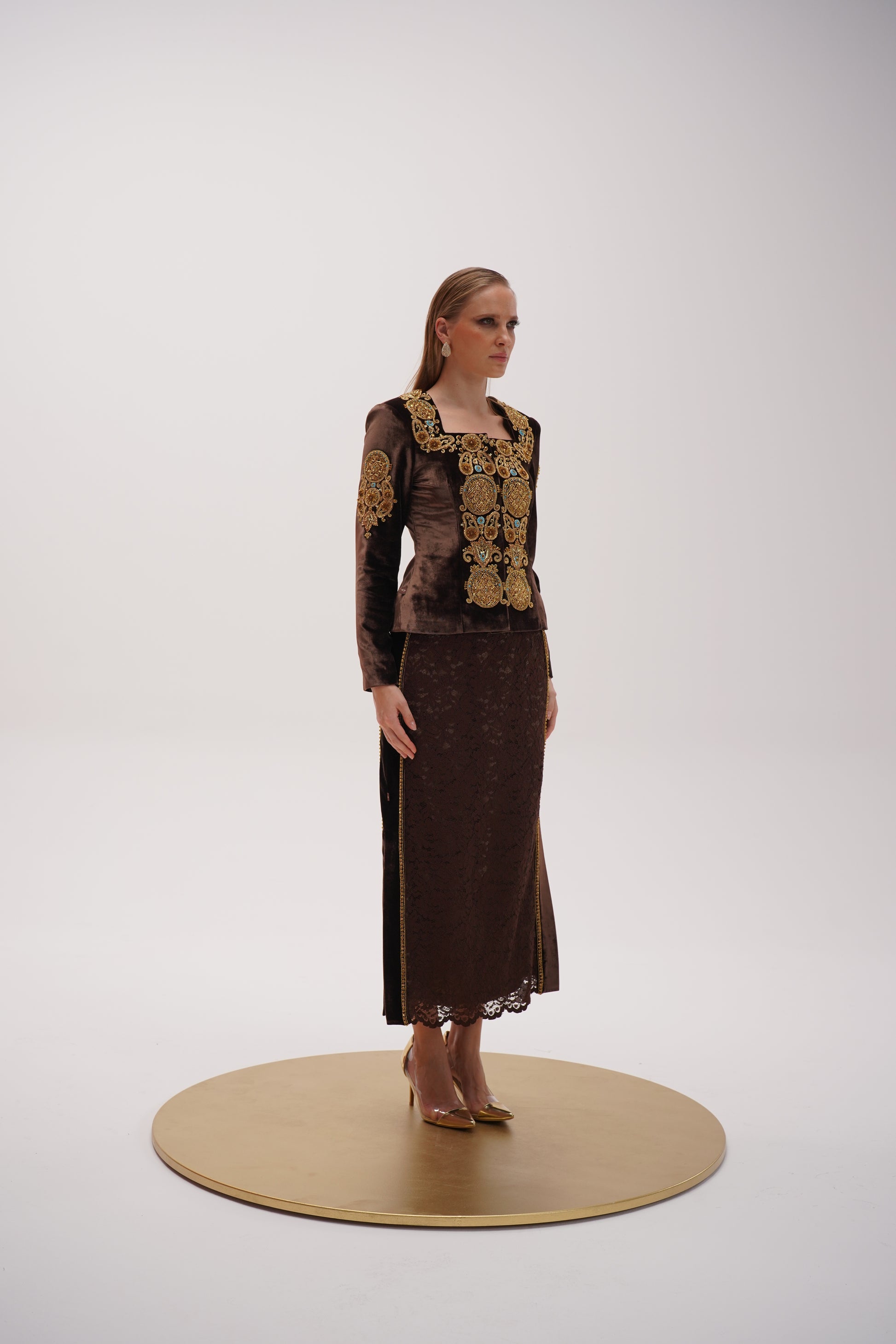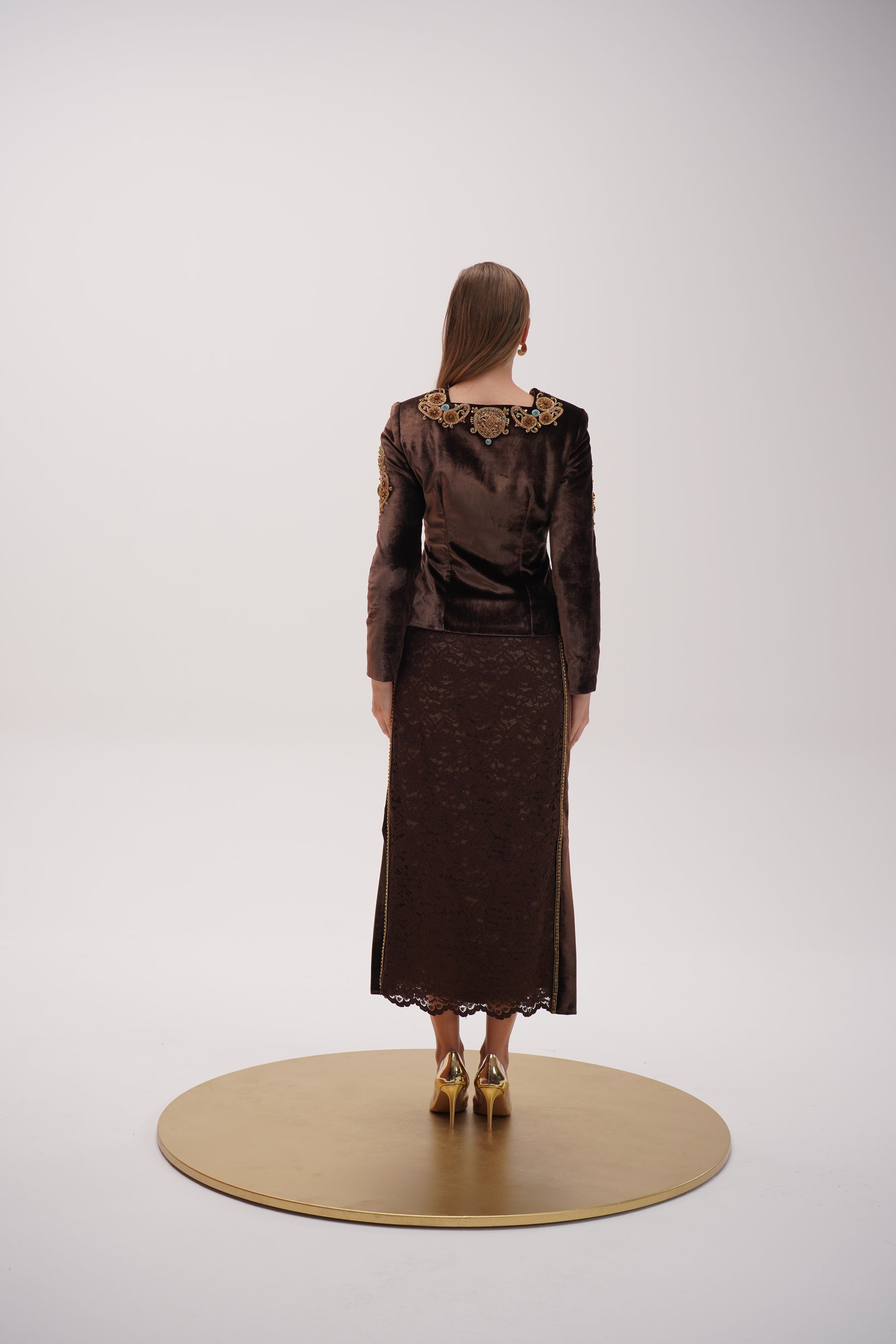 An elegant two-piece ensemble square-cut neckline, fitted auburn silk velvet jacket, embellished with gold, turquoise and delicate beads matching with long lace skirt that enhances the feminine power and sophistication.