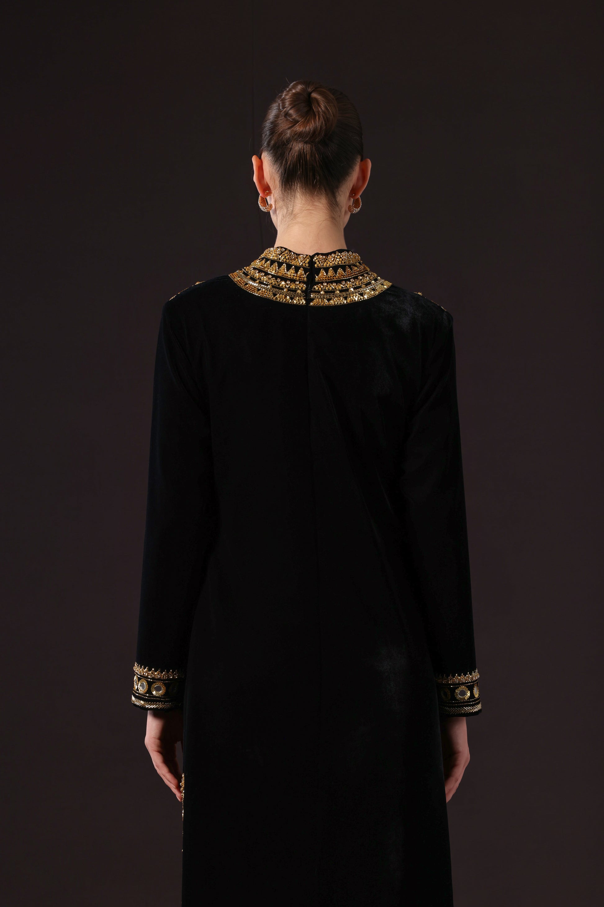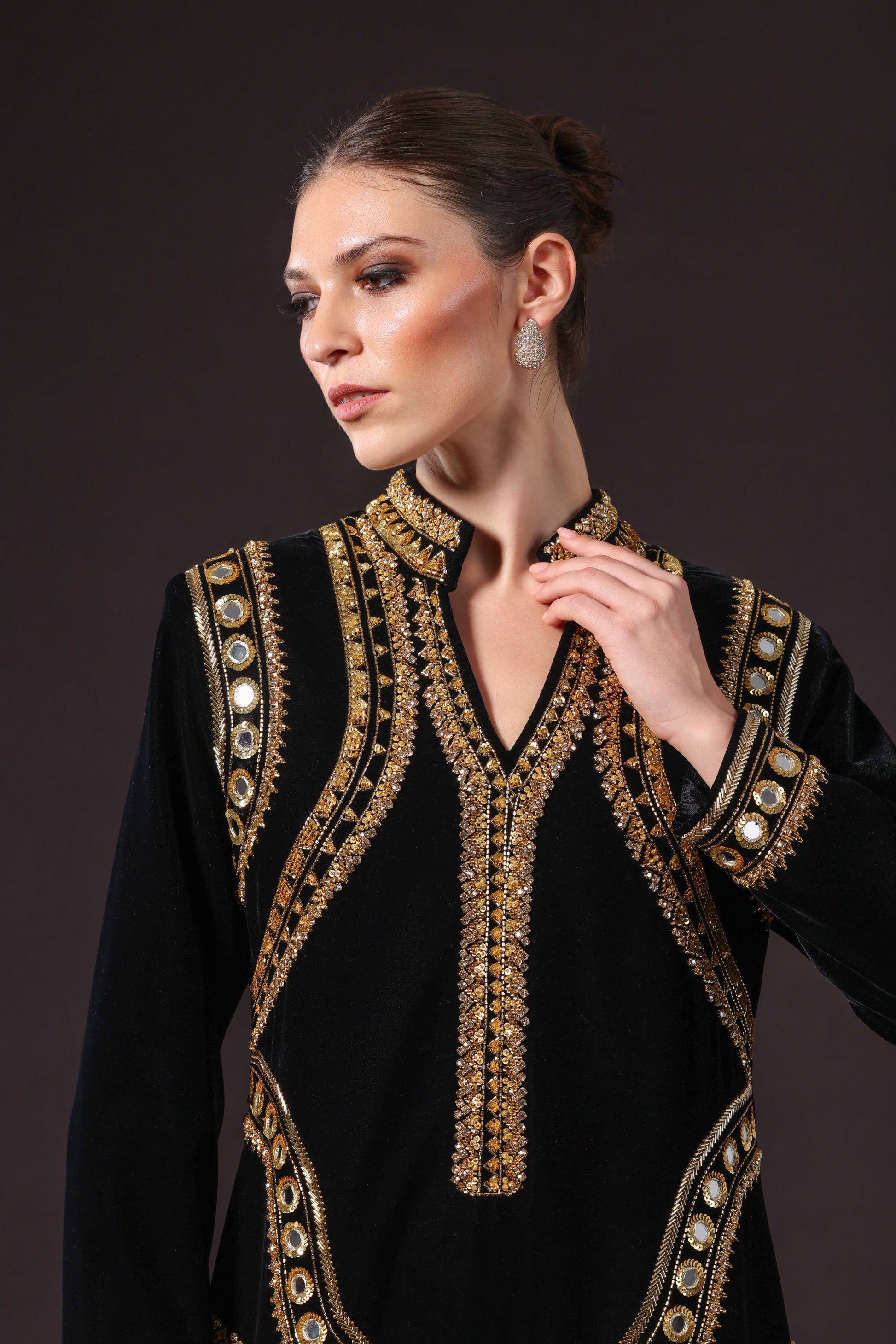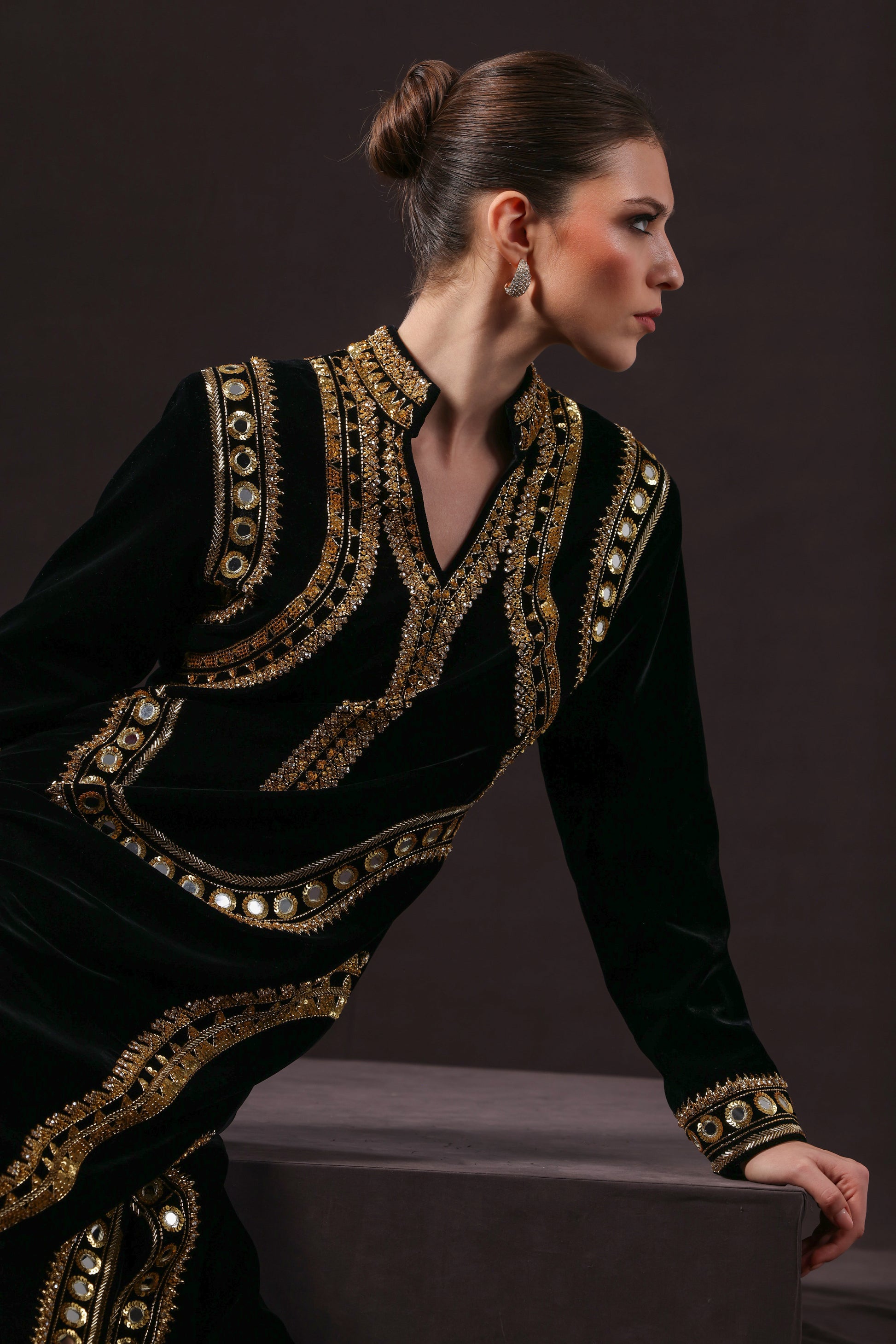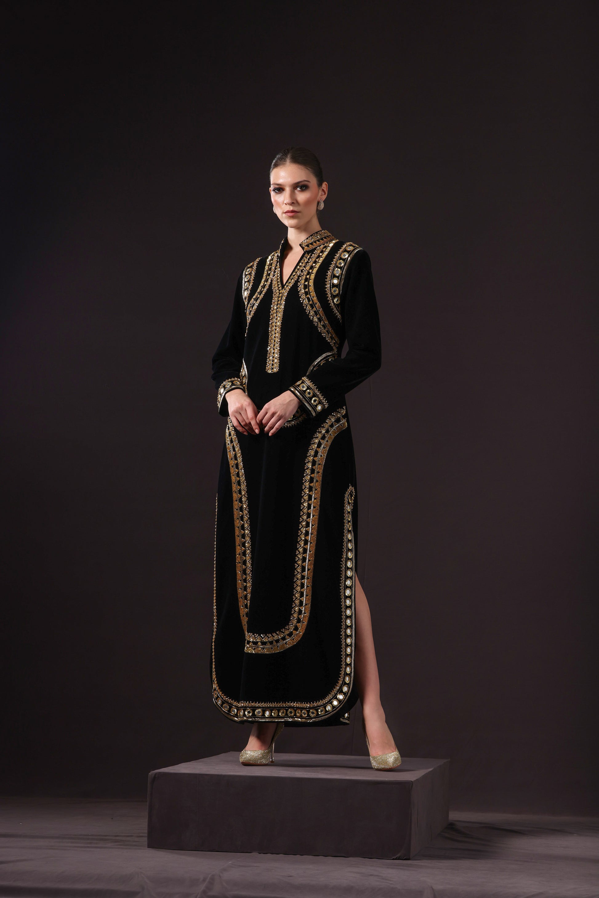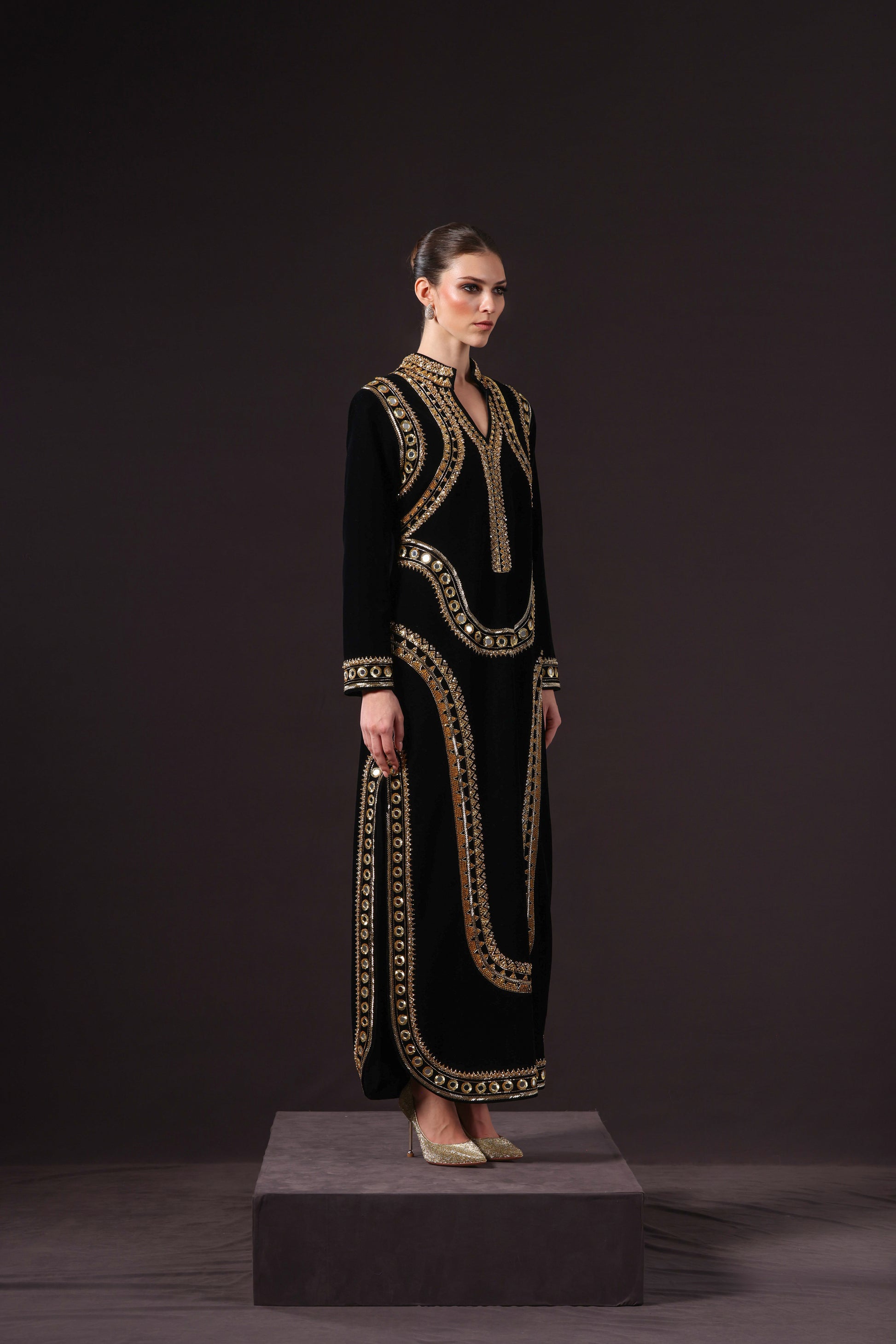 Noir silk velvet kaftan with side slits, handmade embroidered small mirror with unique cuts are handcrafted by skilled artisans. Detailed embroidery and rich fabric giving it a luxurious appearance.