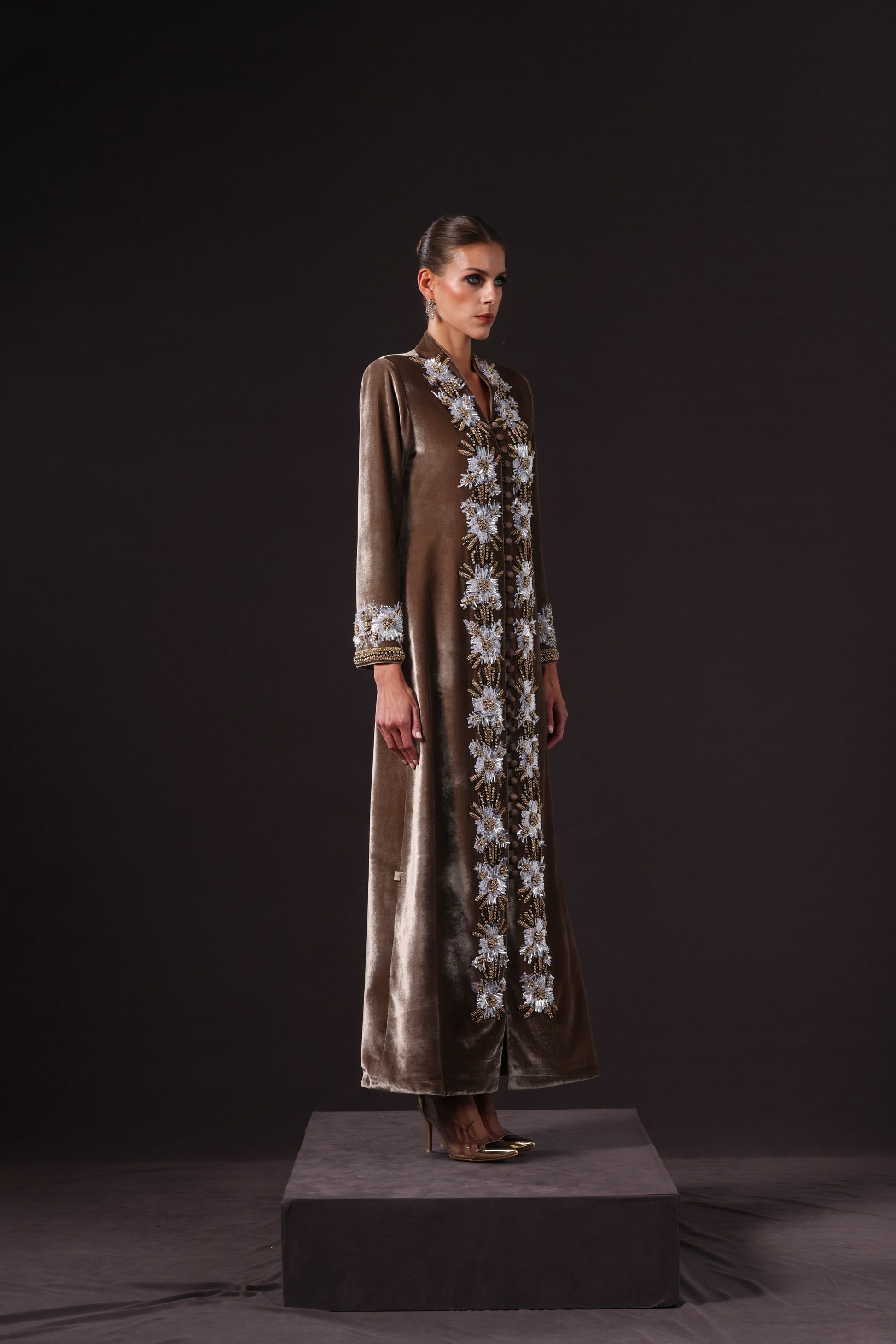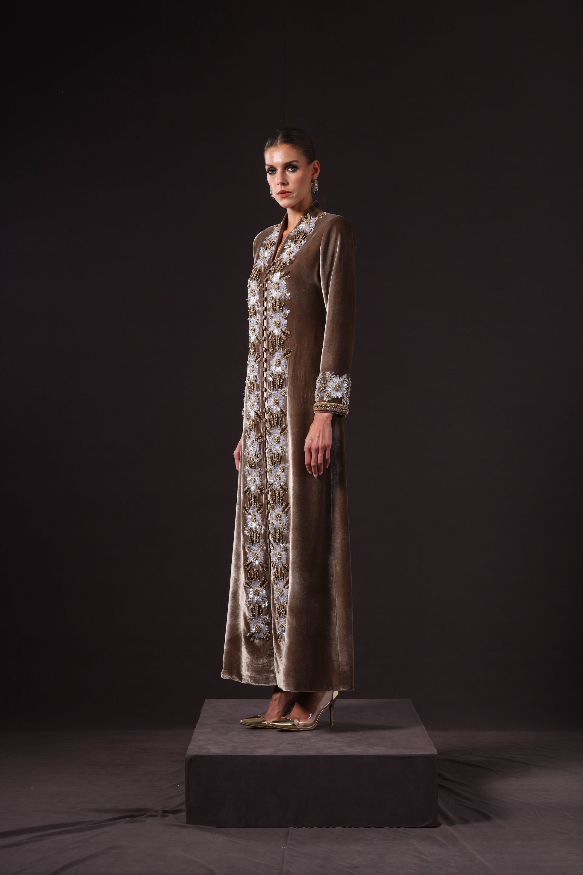 Hazelnut straight-cut silhouette, delicately crafted in silk velvet, buttoned up with Swarovski embellishments on the cuffs and front panel.
