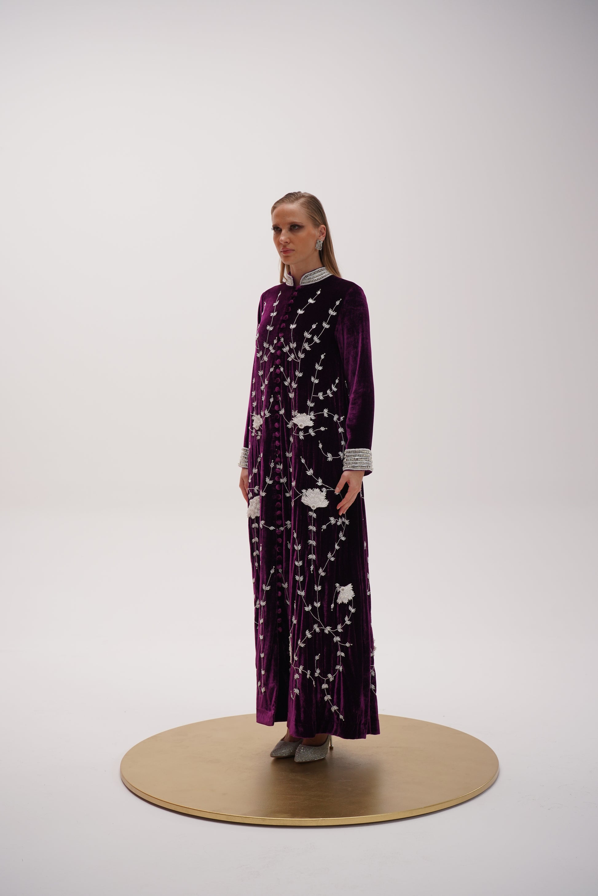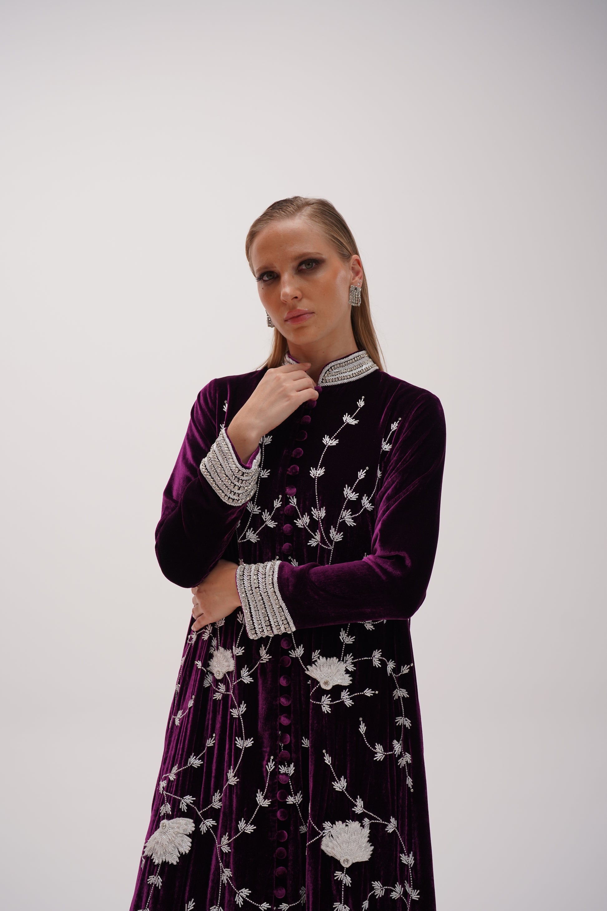 Magenta silk velvet kaftan embellished with fine Swarovski beads along the cuffs and collar, handmade embroidery white floral patterns that create its elegant design.
