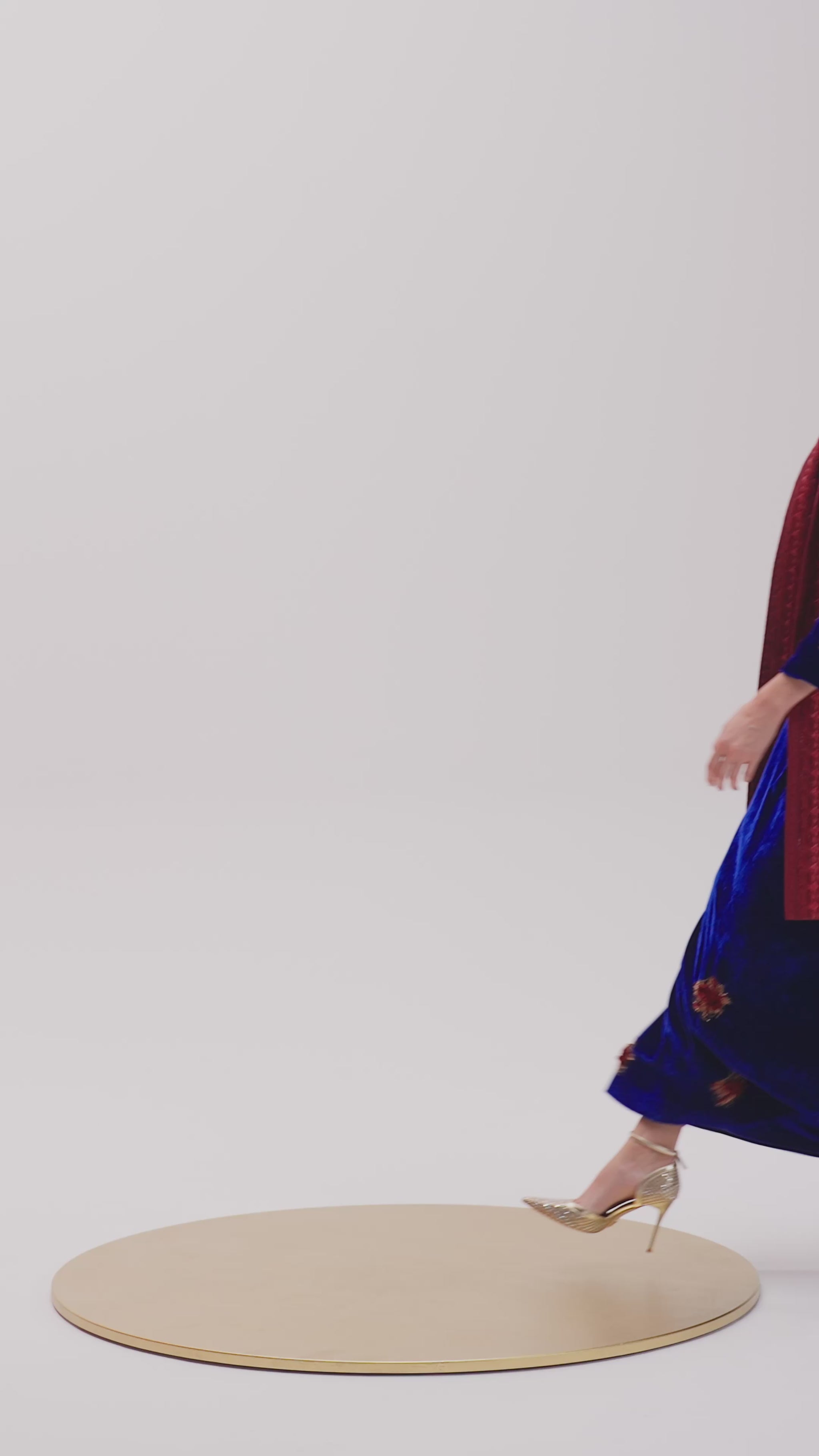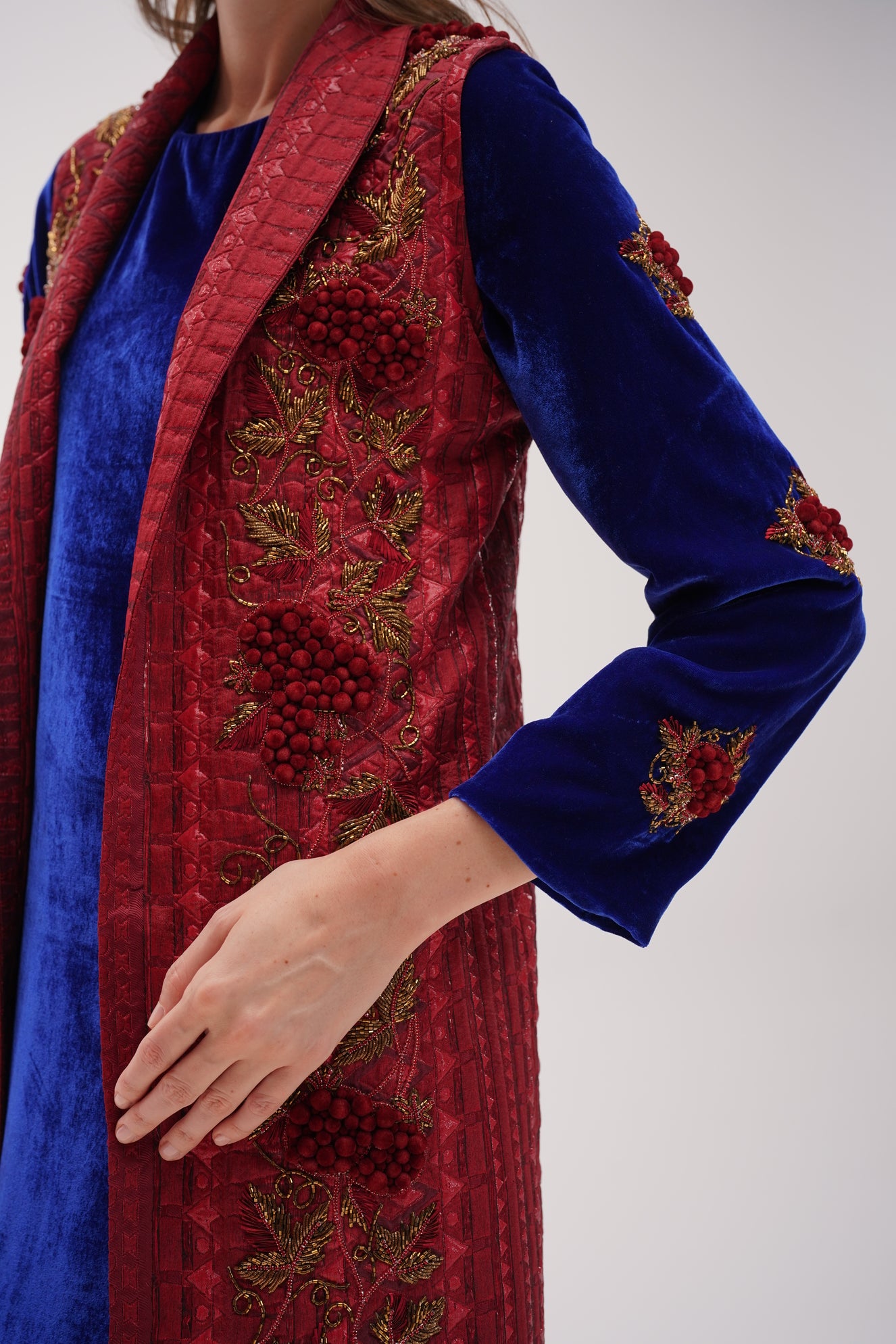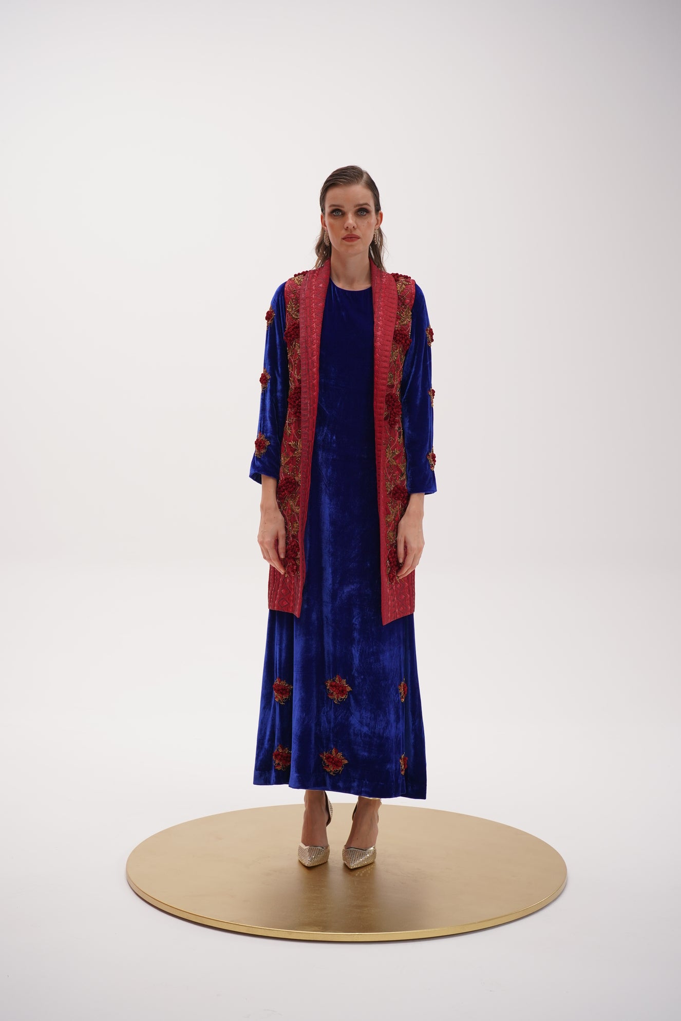 A striking contrast of deep royal blue relaxed elongated silhouette, crafted from plush velvet paired with muted crimson sleeveless overlay, enriched with gold-toned embroidery, adds structure and definition.