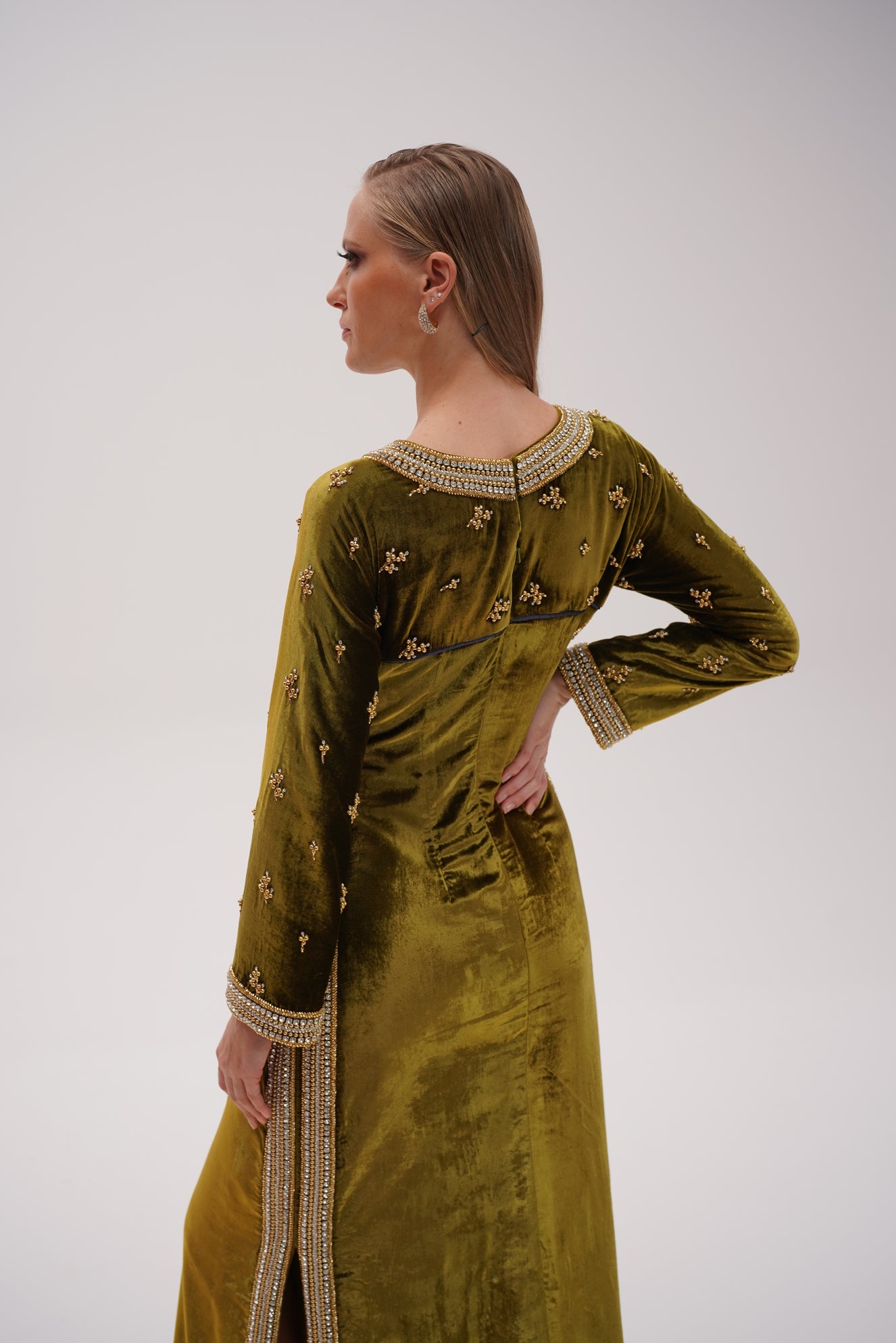 Deep olive green velvet gown, frame with luminous beadwork with side slits, layered blue Italian Mikado jacket richly hand-embroidered with gold-toned and metallic thread motifs with modern edge.