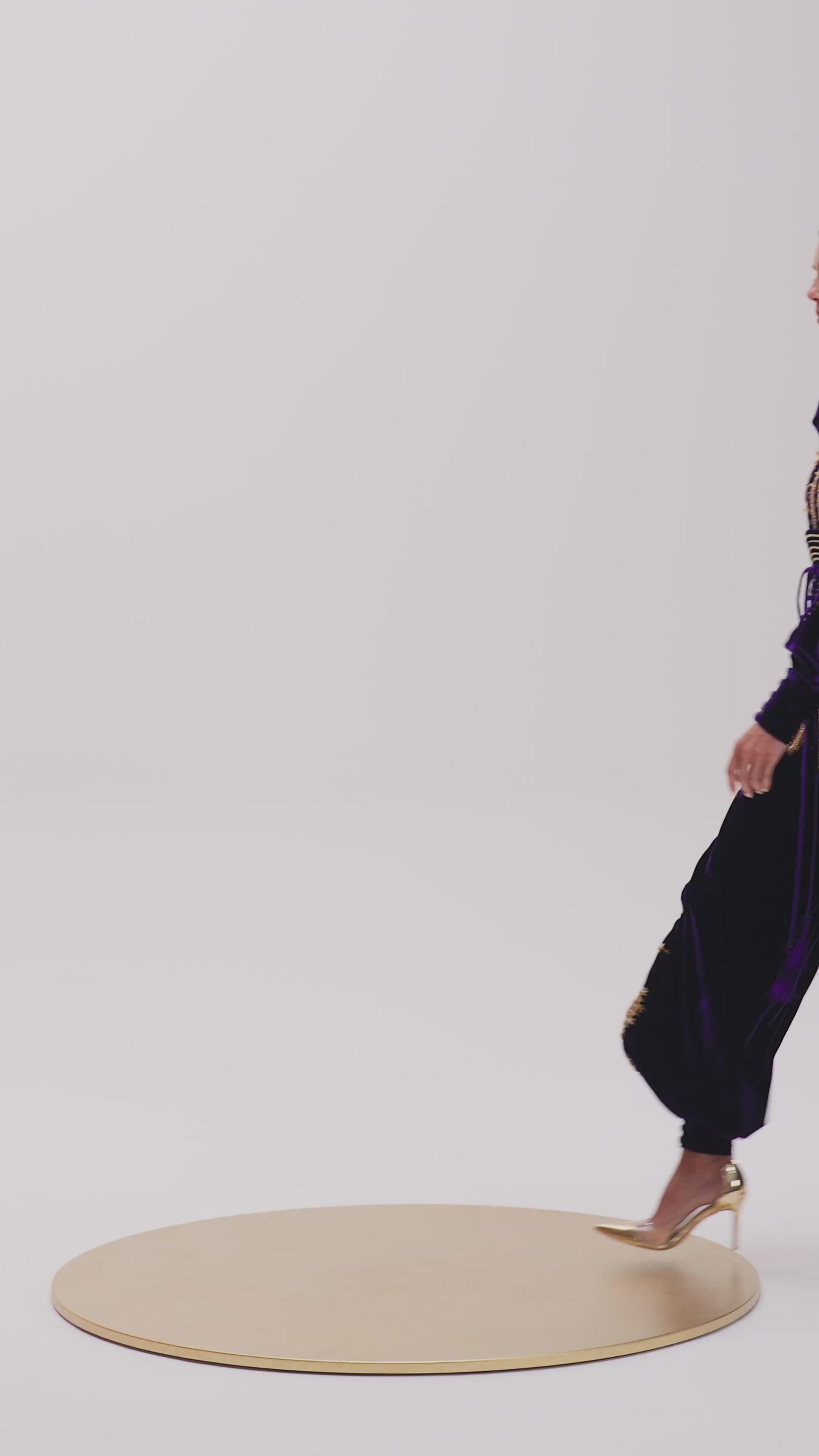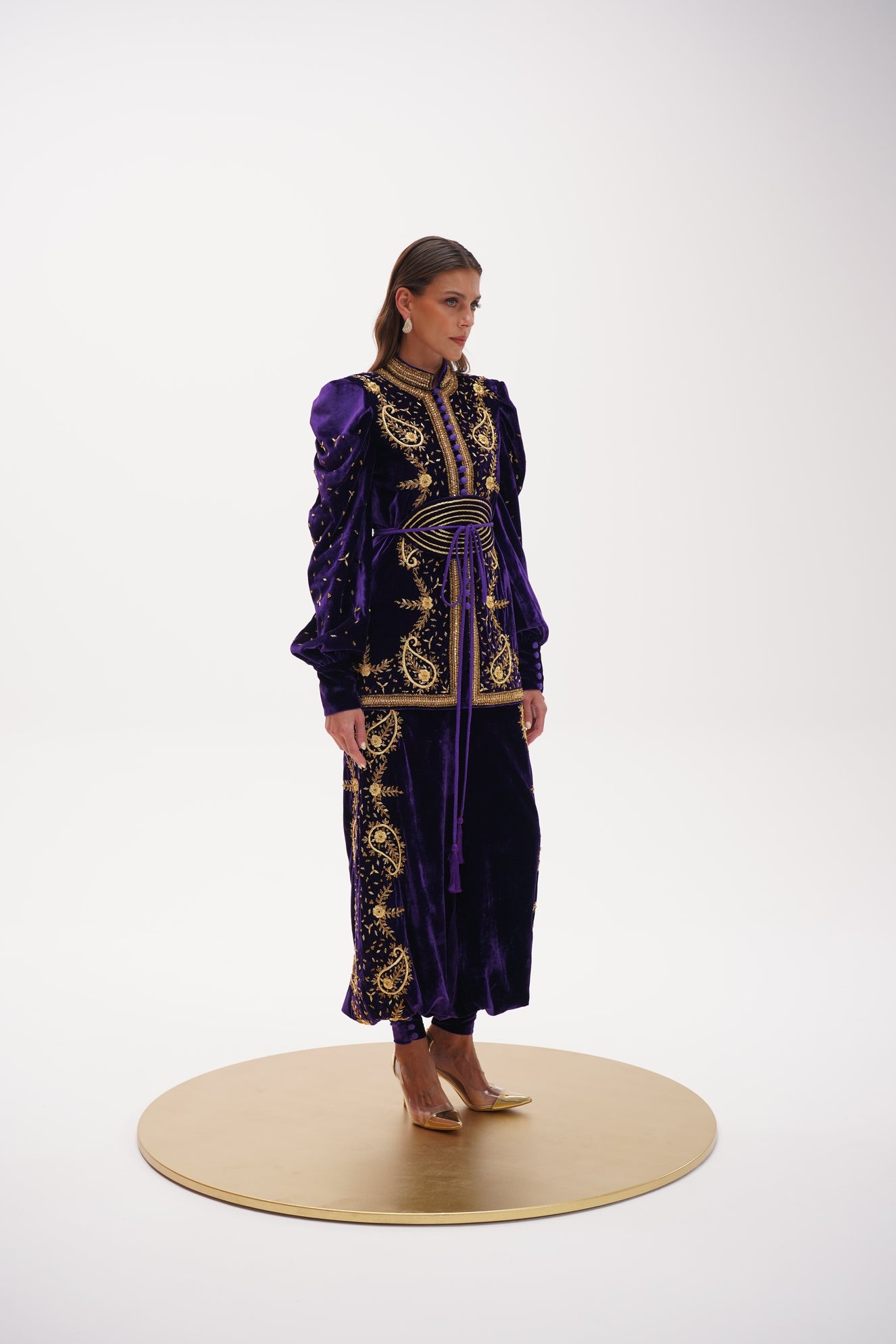 Regal royal-purple velvet two-piece with ornate gold embroidery and bead embellishment, statement sleeves and a softly defined waist and harem pants falls straight with a modest, elegant drape.