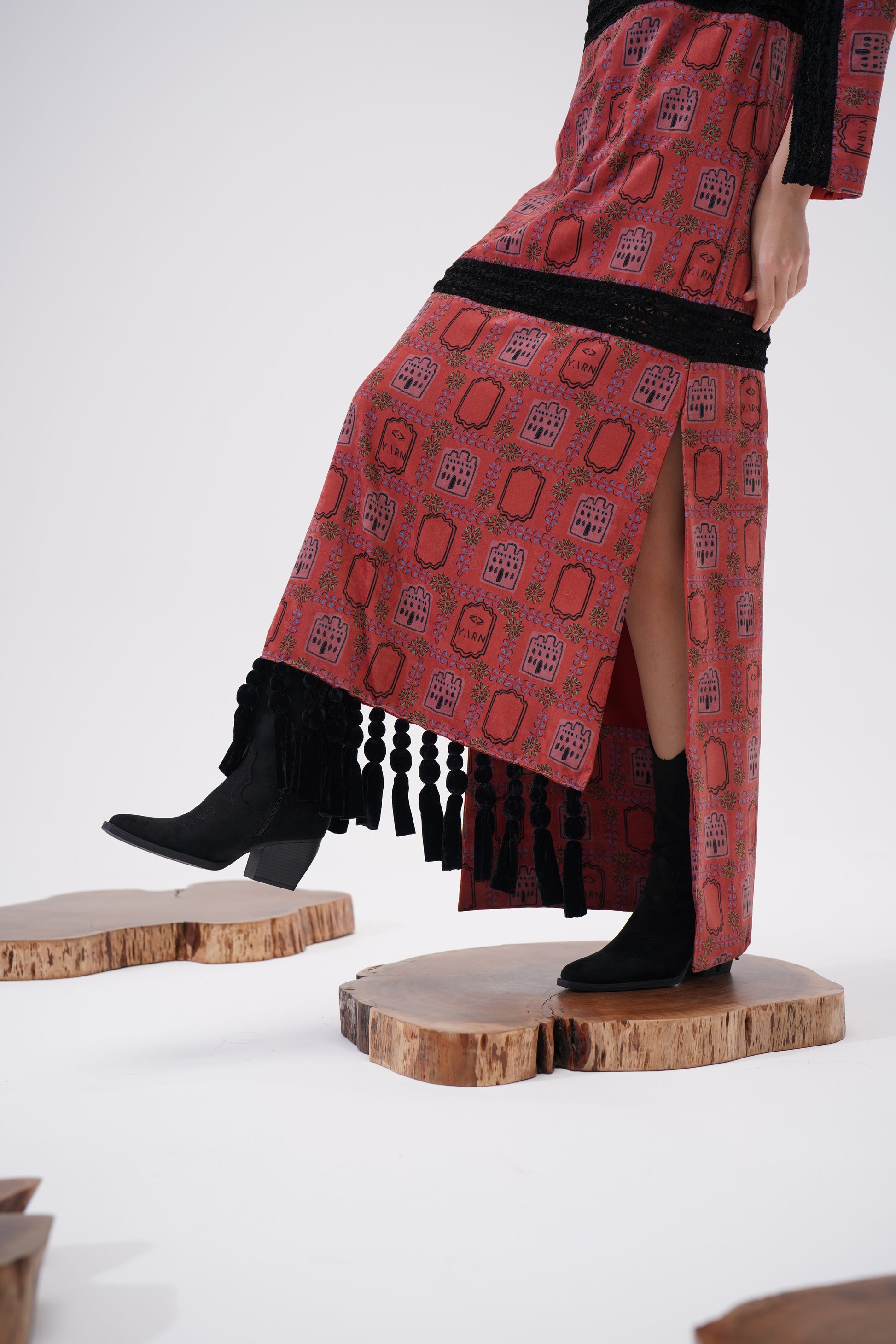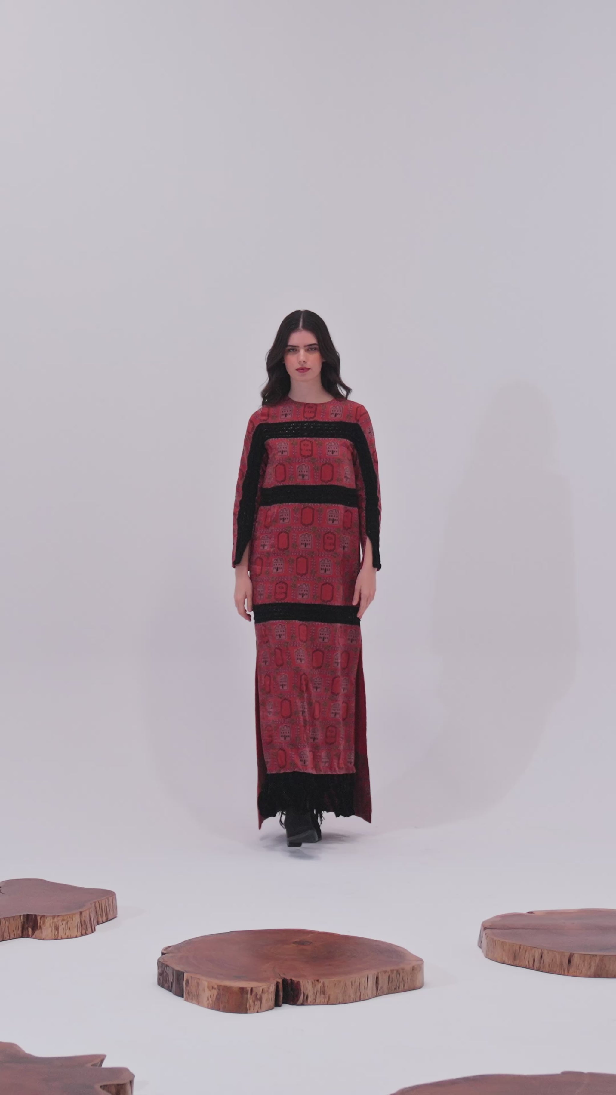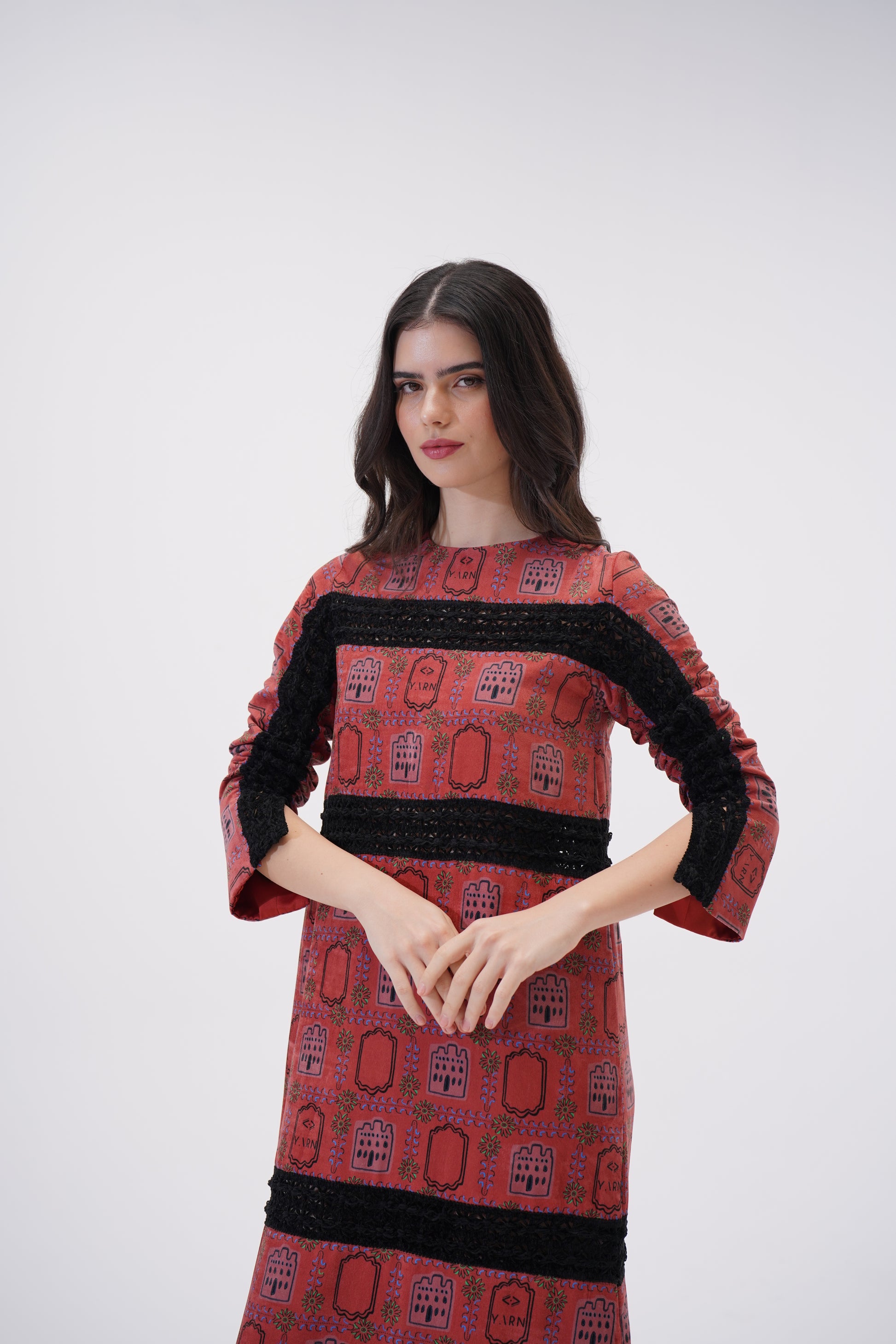 A rich brick-red personalized YARN print straight-cut dress, contrasted black hand-worked crochet pattern that frame the silhouette with elegance.