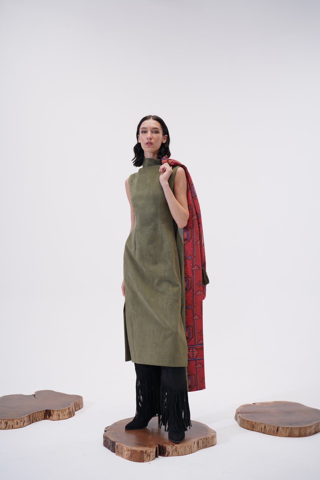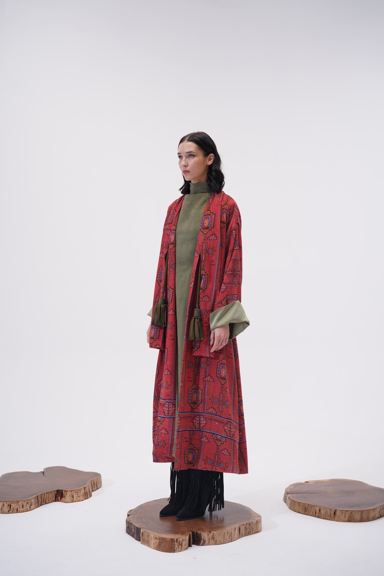 Crafted from light-suede with a soft hand feel rich deep red outer layer, falls effortlessly from the shoulder, wide sleeves with contrasting olive cuffs, while the muted olive green sleeveless inner dress offers a clean, structured base.