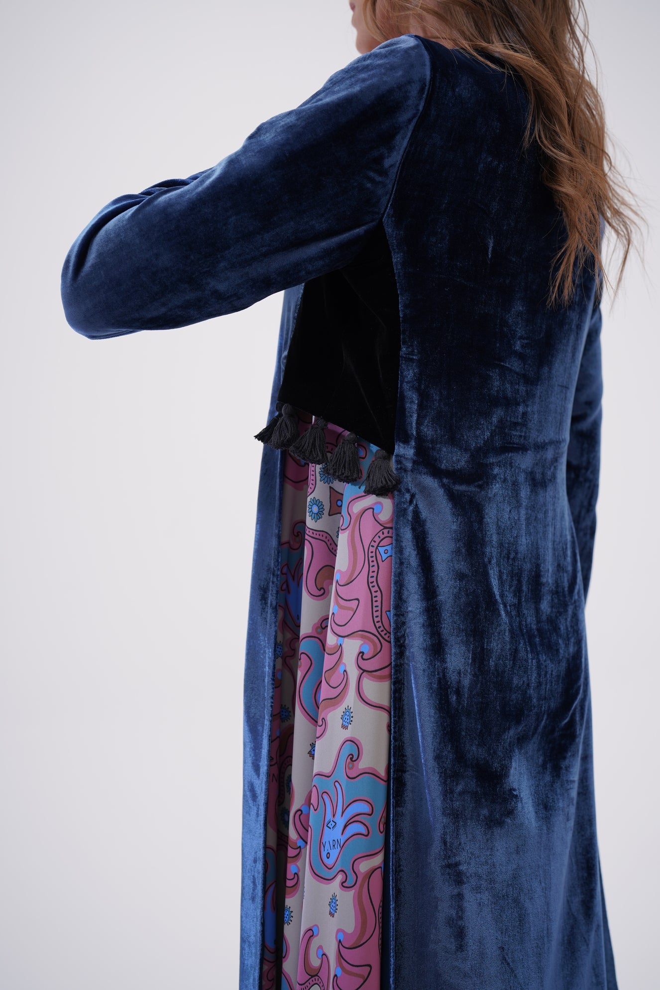 Deep midnight blue velvet outer layer with subtle sheen, concealed personalized YARN print inner panel, side detail and craftmanship, finished with delicate tassel at the seam for a refined artisanal touch.