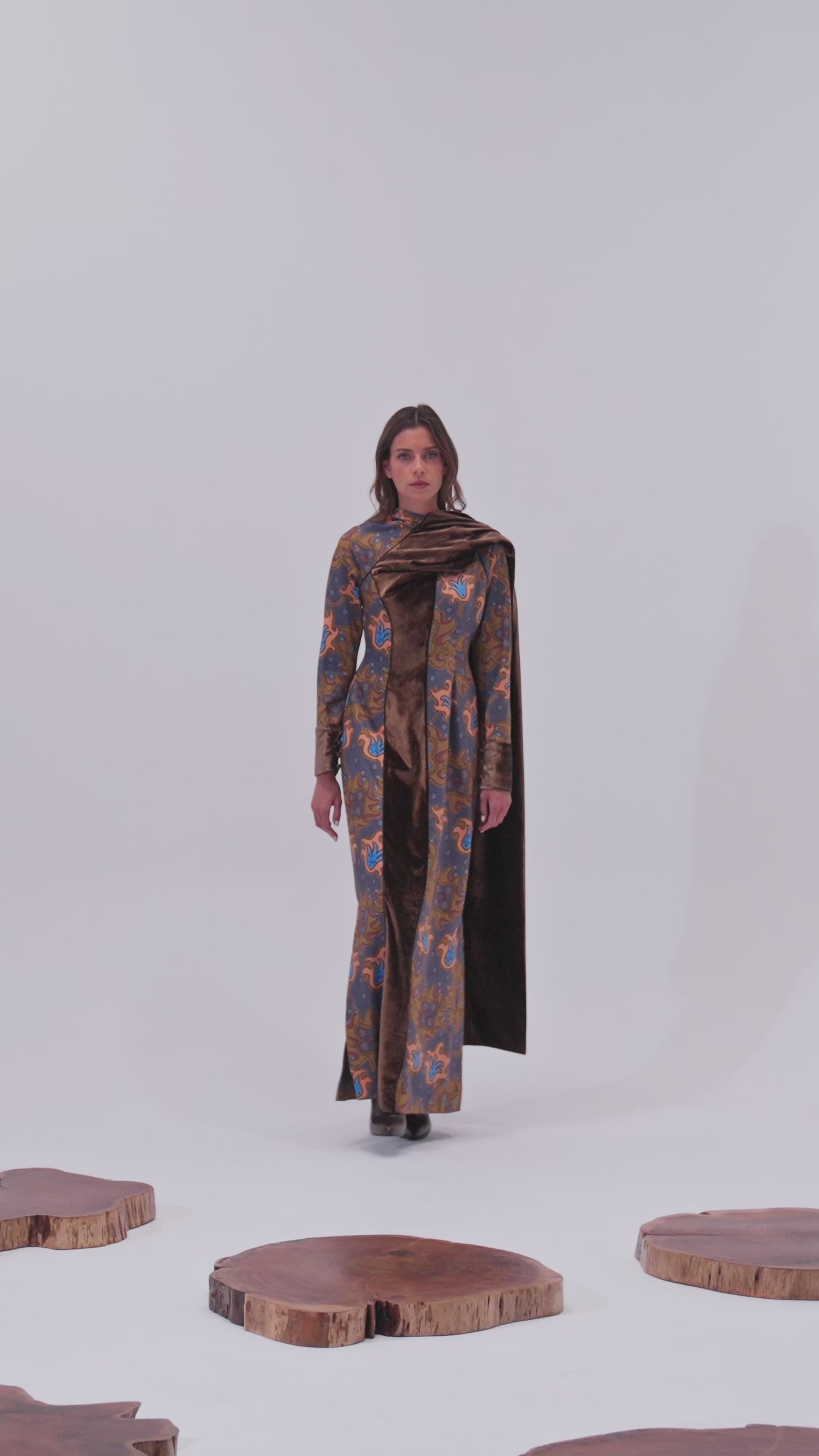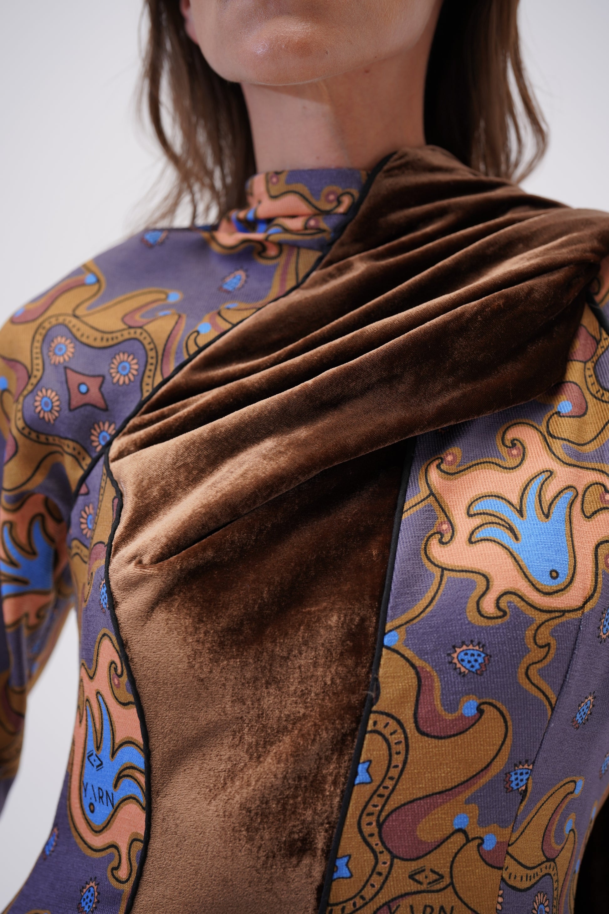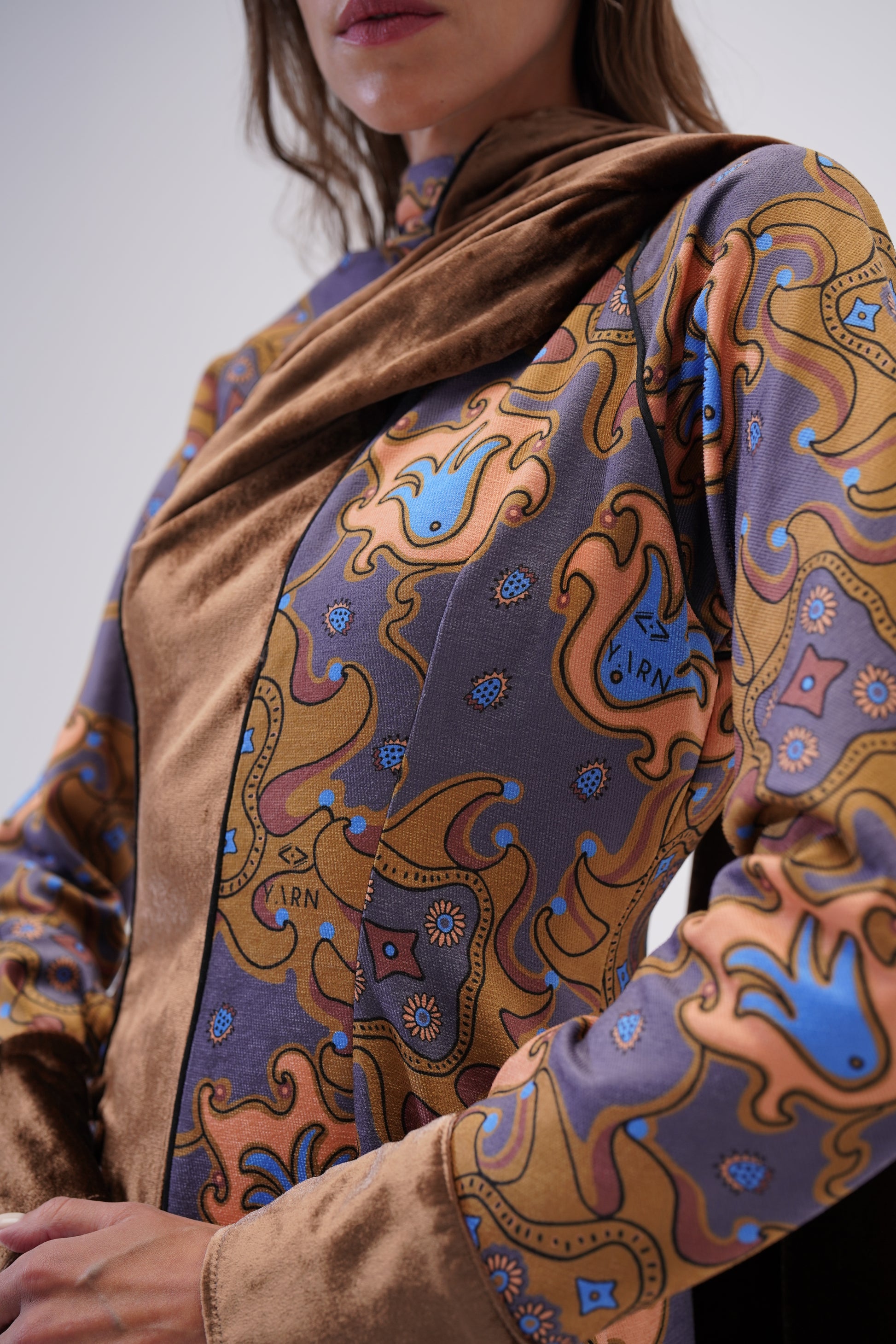 A refined statement slim fit dress, enhanced by a sculptural velvet front panel that cascades diagonally from shoulder, back shawl, down to hem with personalized YARN print, punctuated soft tan, muted slate blue and softly blended earth-tone accents.