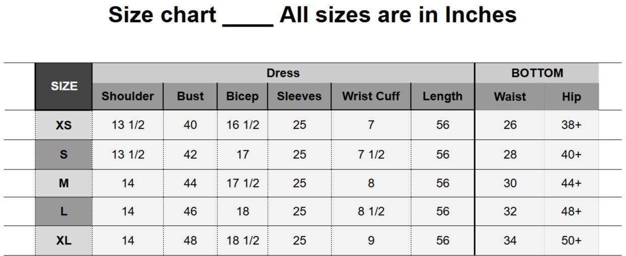 - Please note that all made-to-order outfits are custom-made specifically for you and therefore non-refundable. We do not accept returns on these items. However, if you require a different size, we are happy to offer a one-time size exchange—subject to availability.