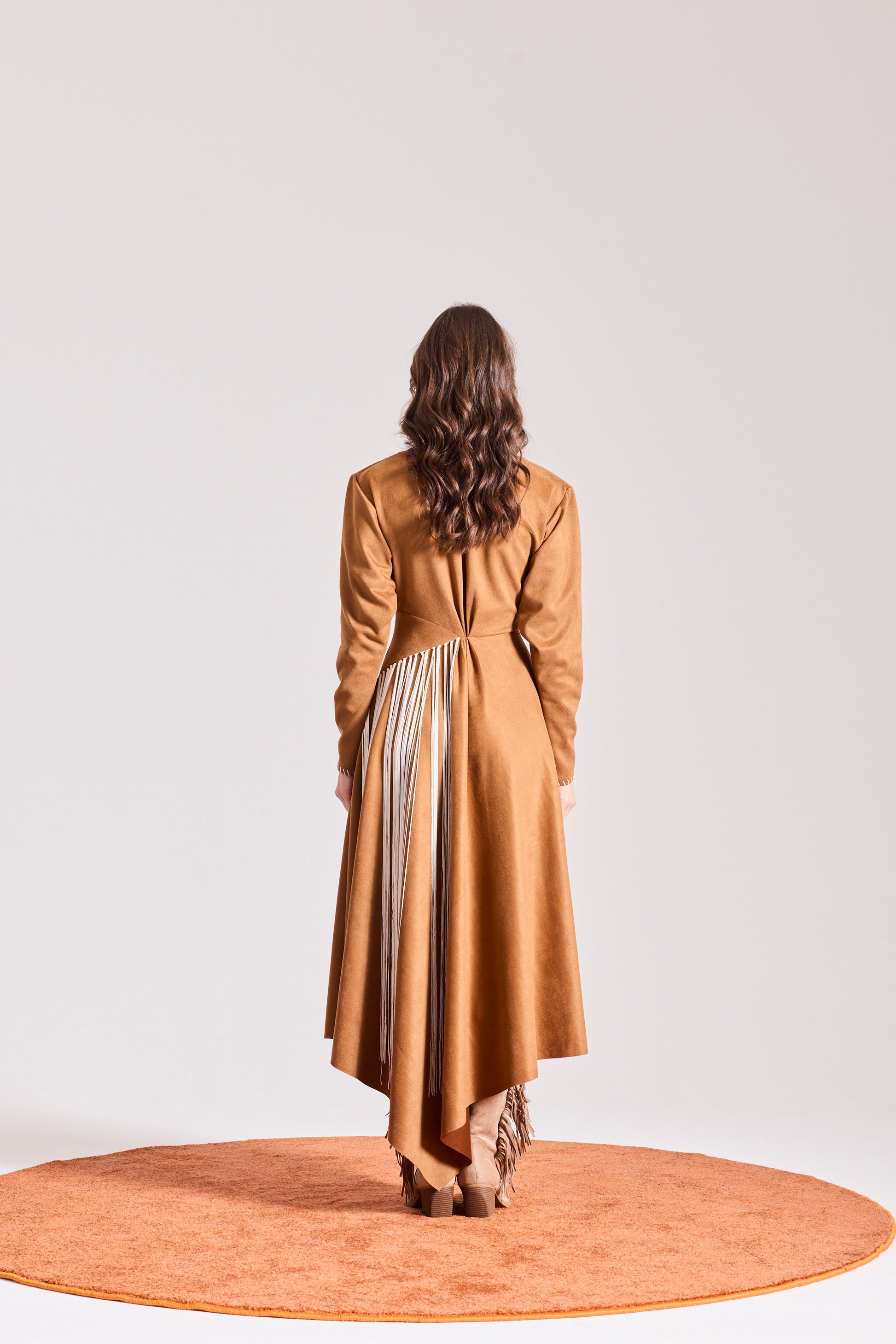 Vertically gathered front microsuede camel dress with asymmetric flared hem and iconic white cream fringes.