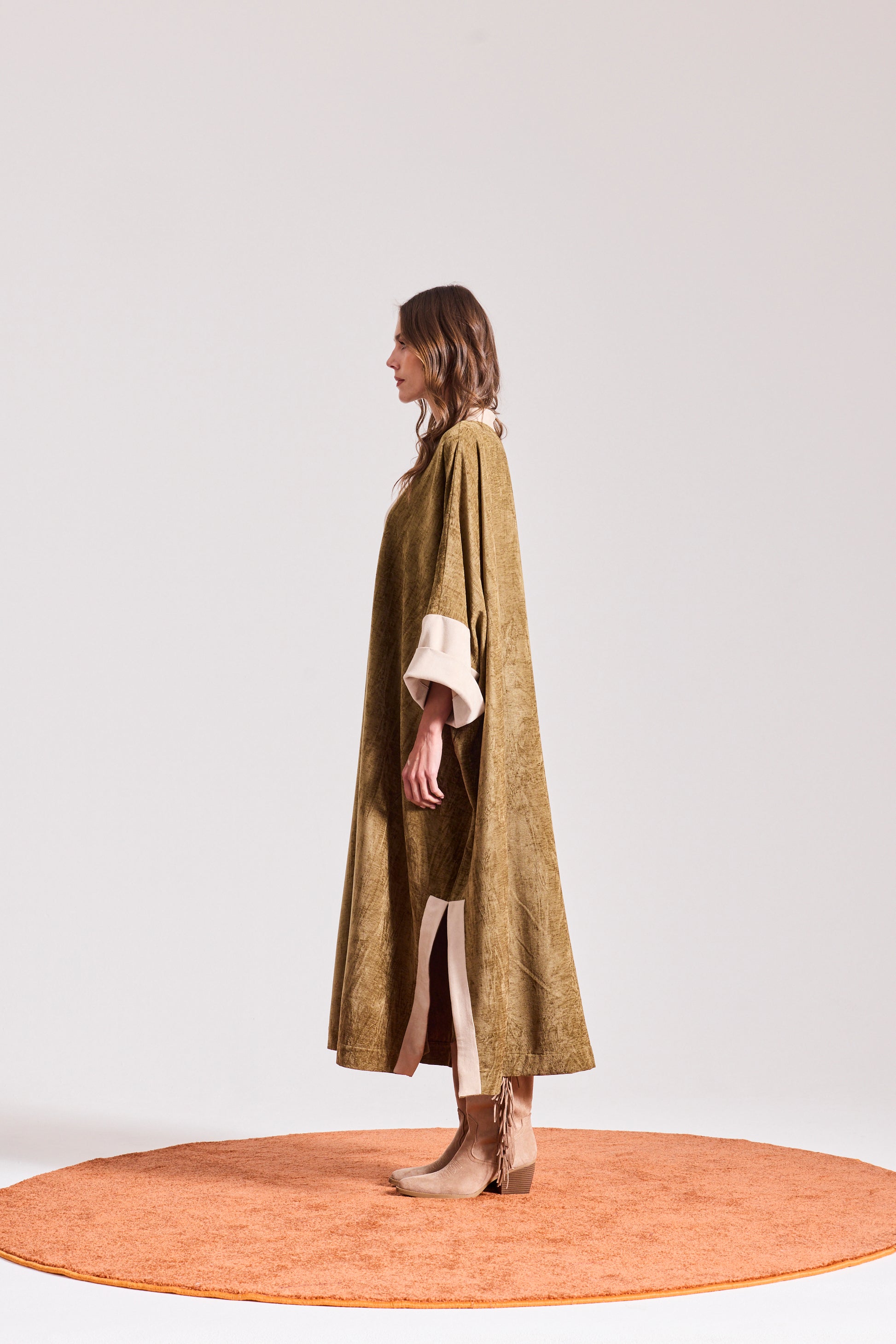A combination of olive green velvet and beige cream microsuede relaxed kaftan with sides slit and detailed front custom buttons .